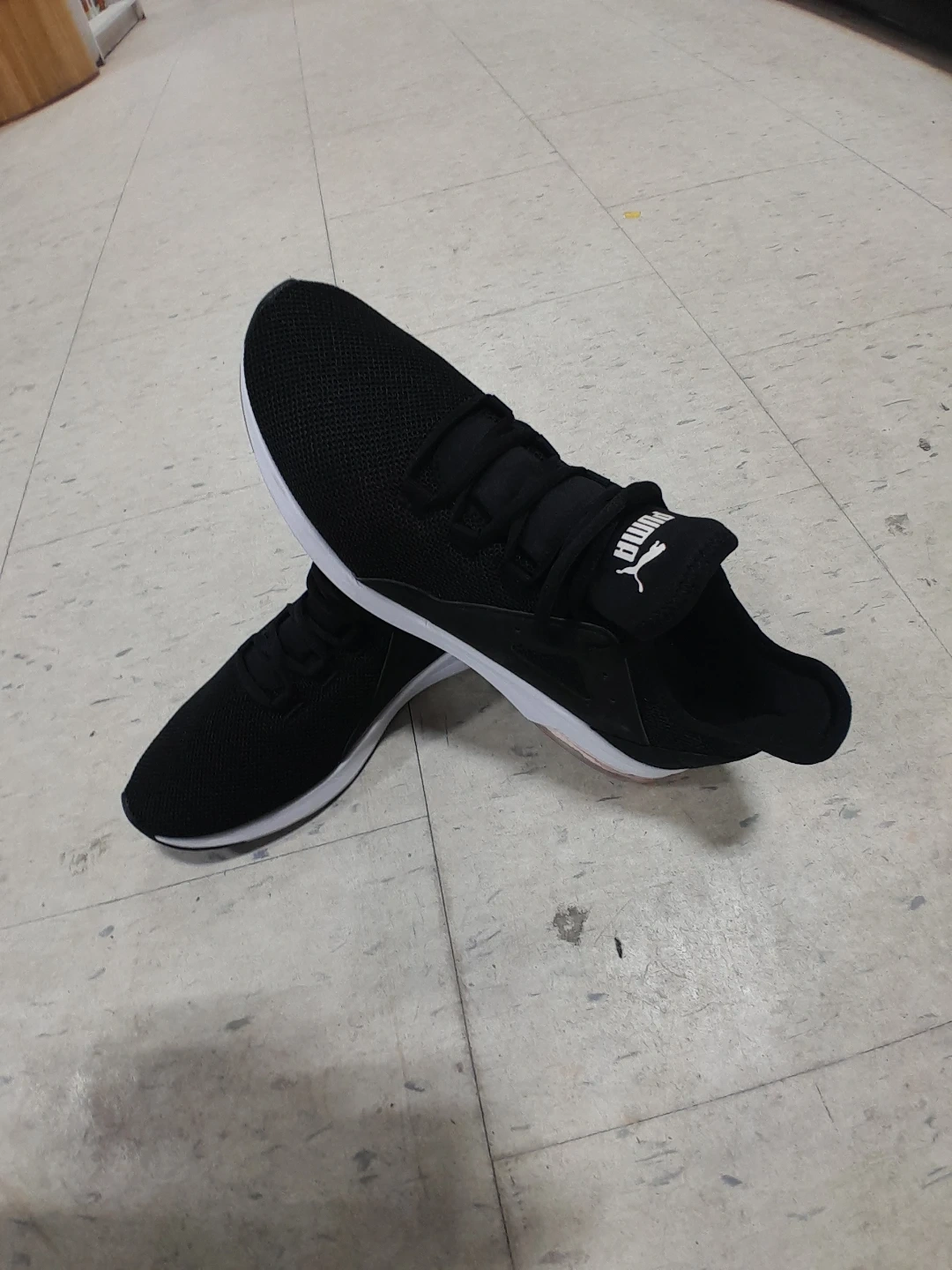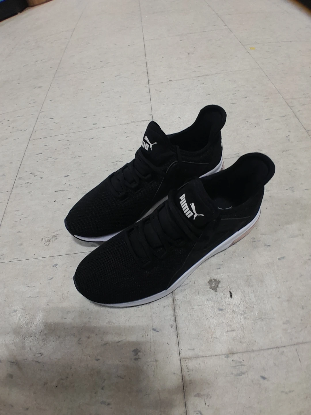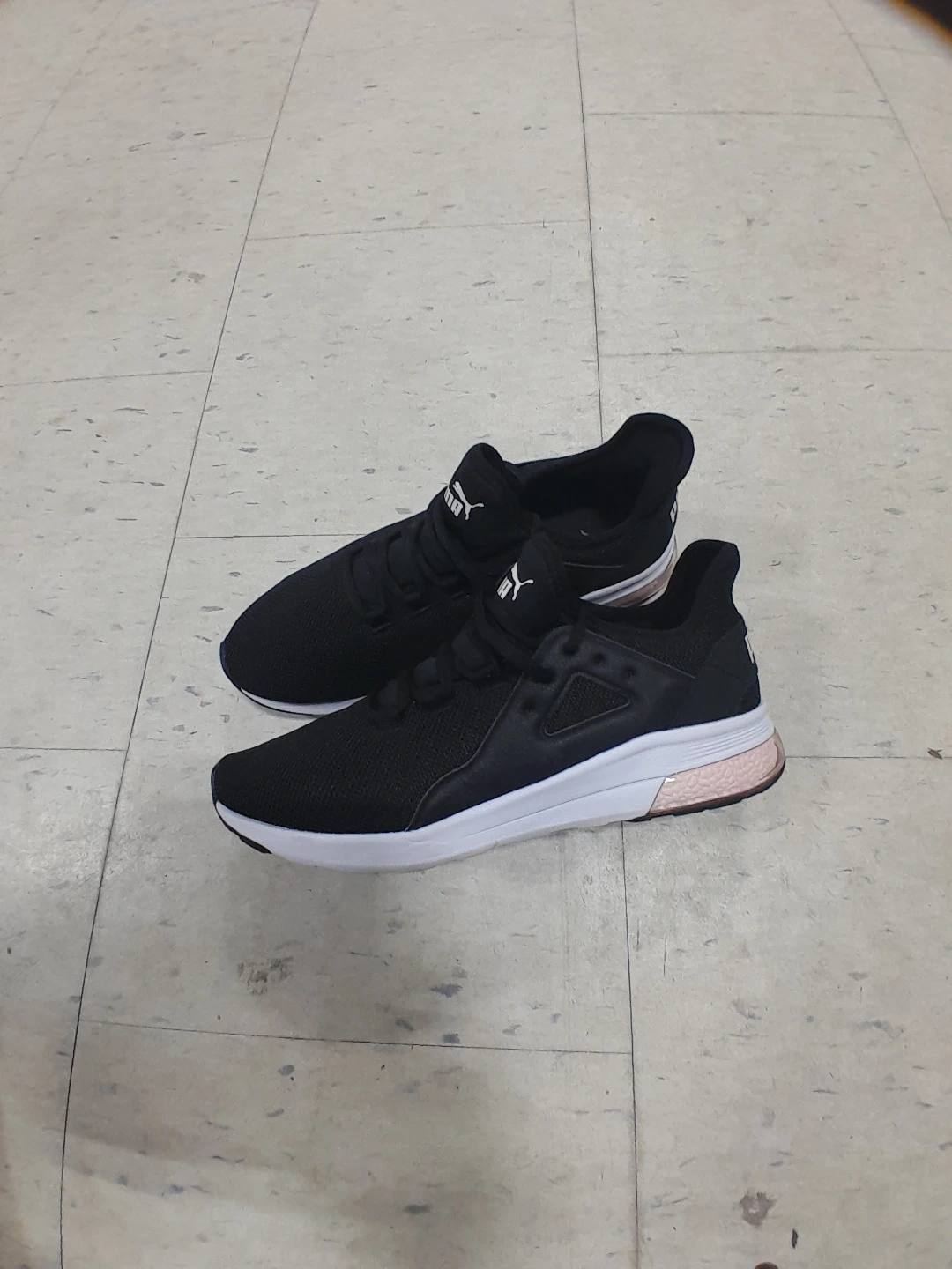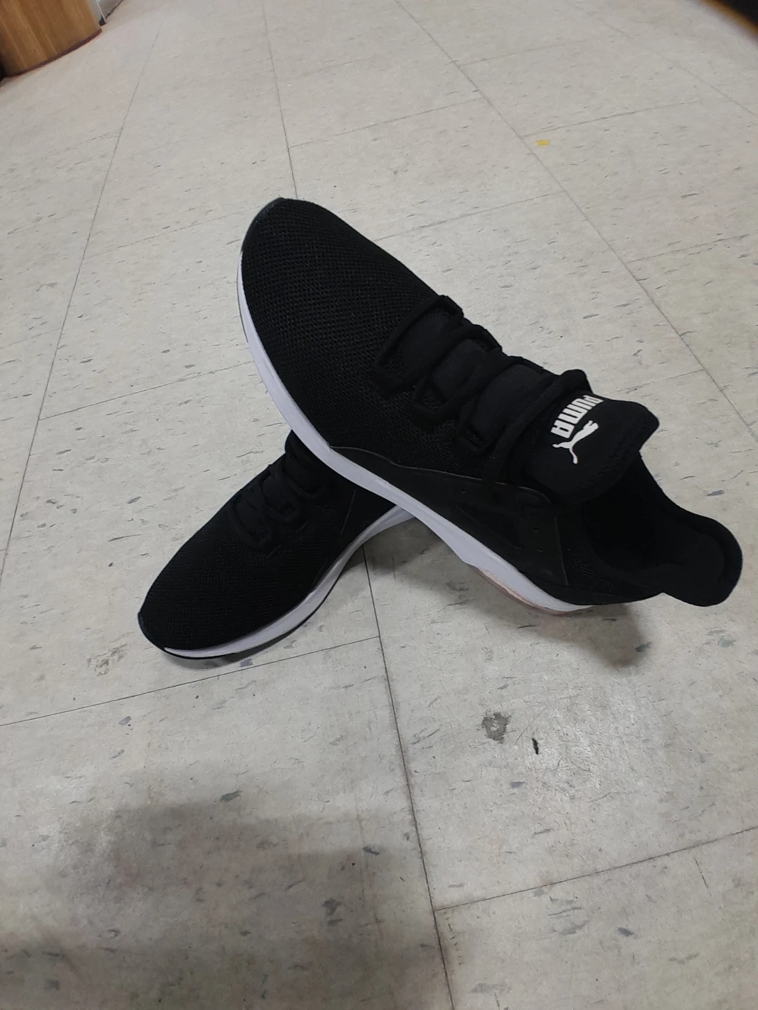 These are black Puma running shoes. They feature a breathable mesh upper and a cushioned sole. These shoes are suitable for everyday wear or light jogging women's size 9.5