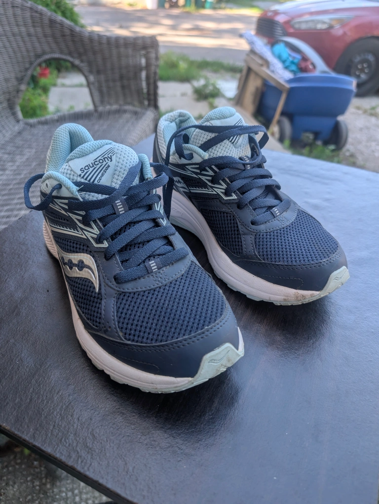 Selling a pair of Saucony Cohesion 14 women's running shoes in size 8.5 US. Fits more like a 7.5 They're in great shape and ready for a new home. Perfect for running or everyday wear!