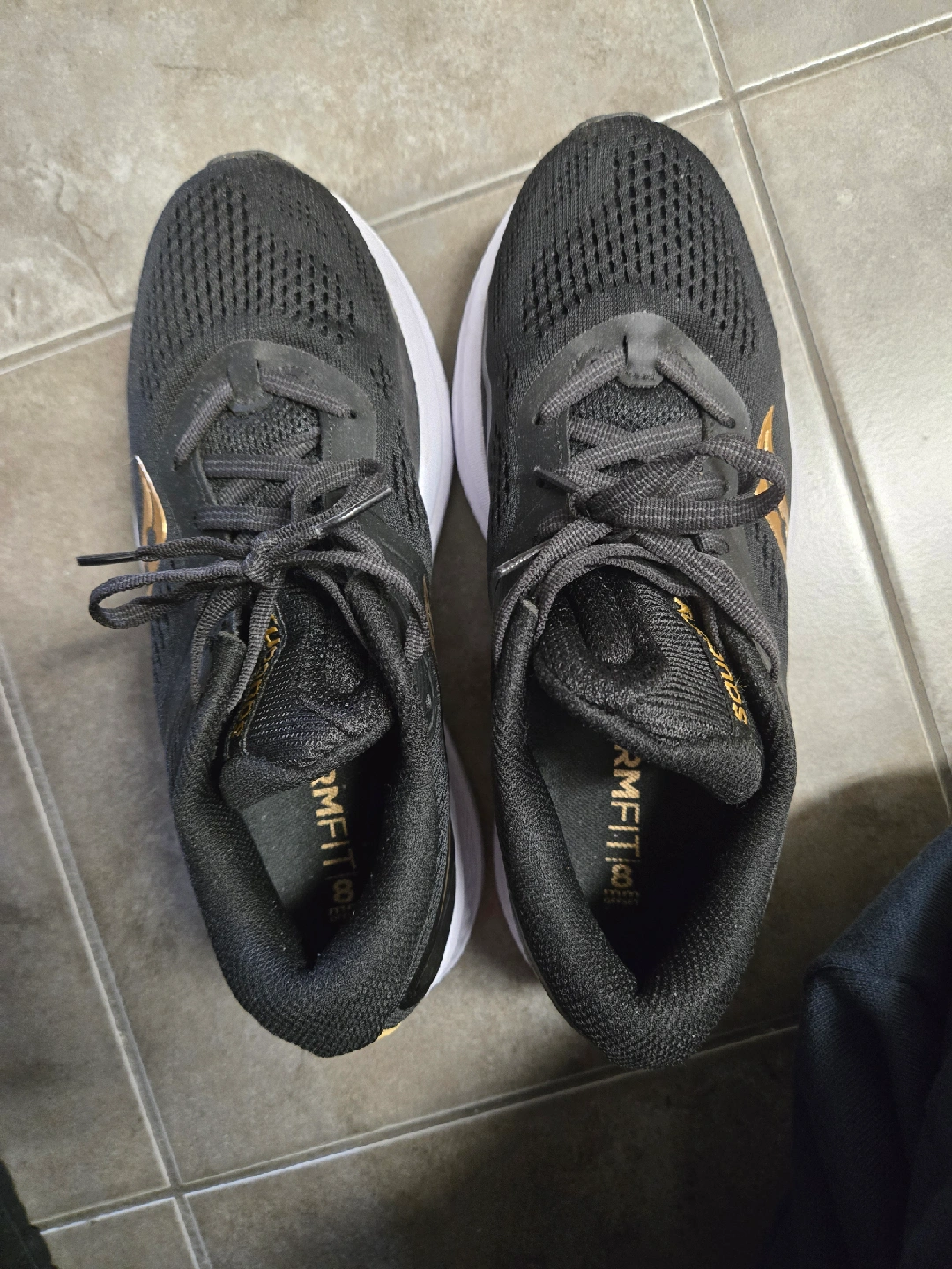 20Selling a pair of Saucony Women's Jazz 22 running shoes in size 7.5 US. These stylish runners feature a sleek black design with gold accents and a comfortable white sole. They're in great shape and ready for your next run!