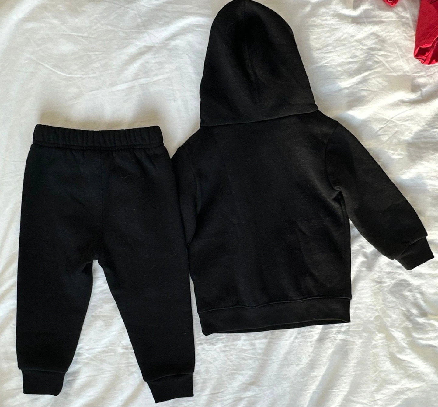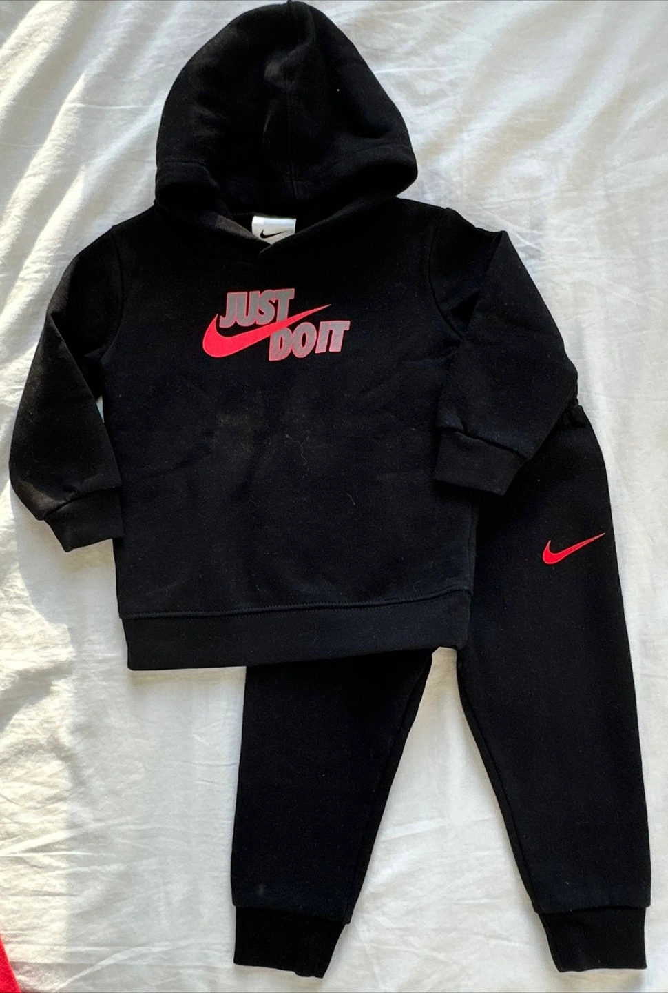 This is a Nike "Just Do It" hoodie and jogger set for kids. It's made in Vietnam and features the iconic Nike swoosh. The set includes a black hoodie with red "Just Do It" graphic and matching black joggers. Available in size 18M (80-86 cm).