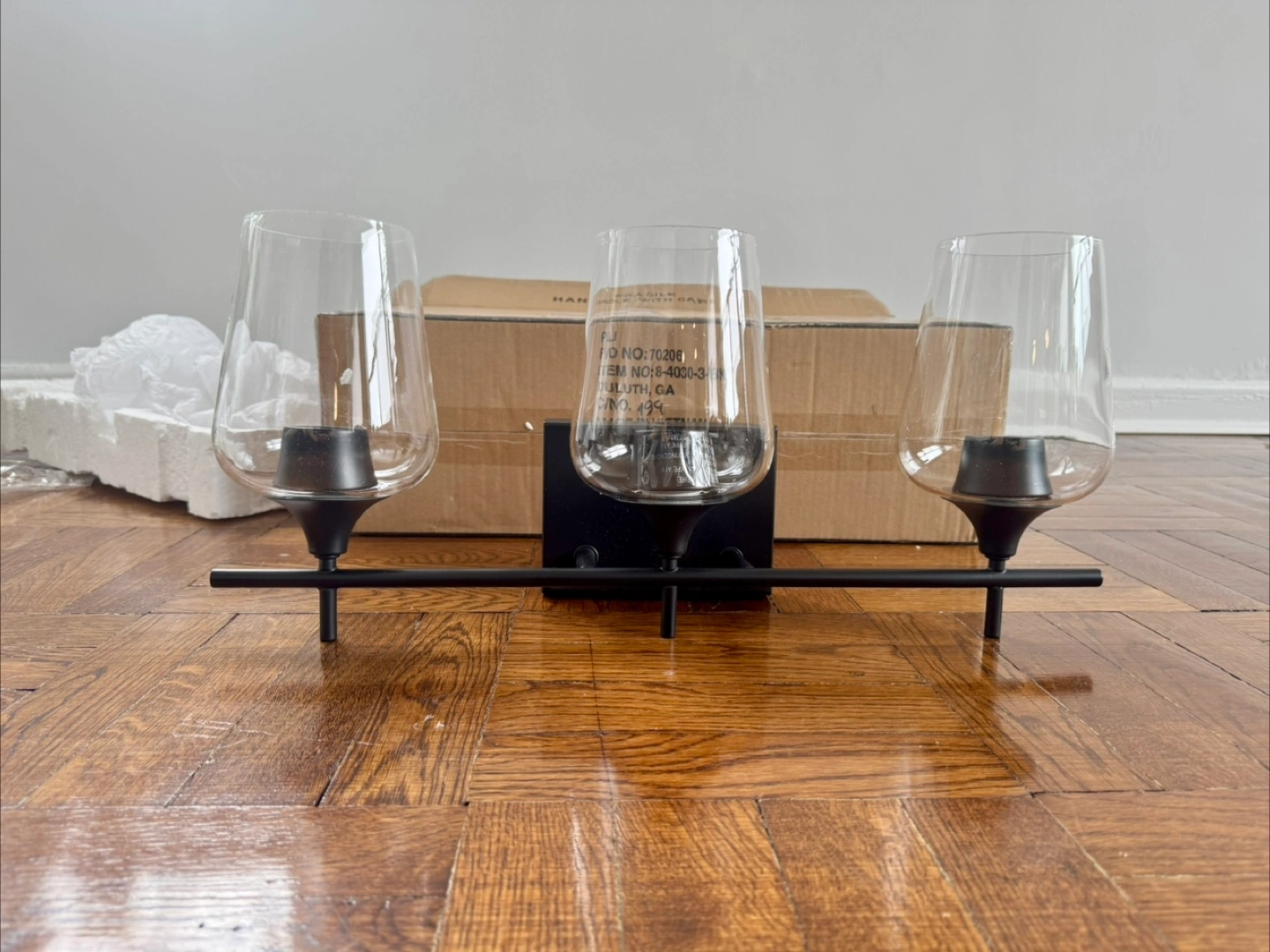 Brand new in box. Three-light vanity light fixture. Black metal frame. Clear glass shades.