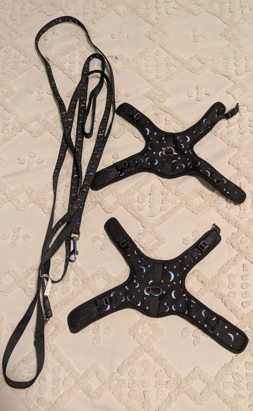 This cat harness and leash set features a fun crescent moon and star pattern on black fabric. It includes two harnesses and one leash. Adjustable straps ensure a comfy fit for your canine pal!