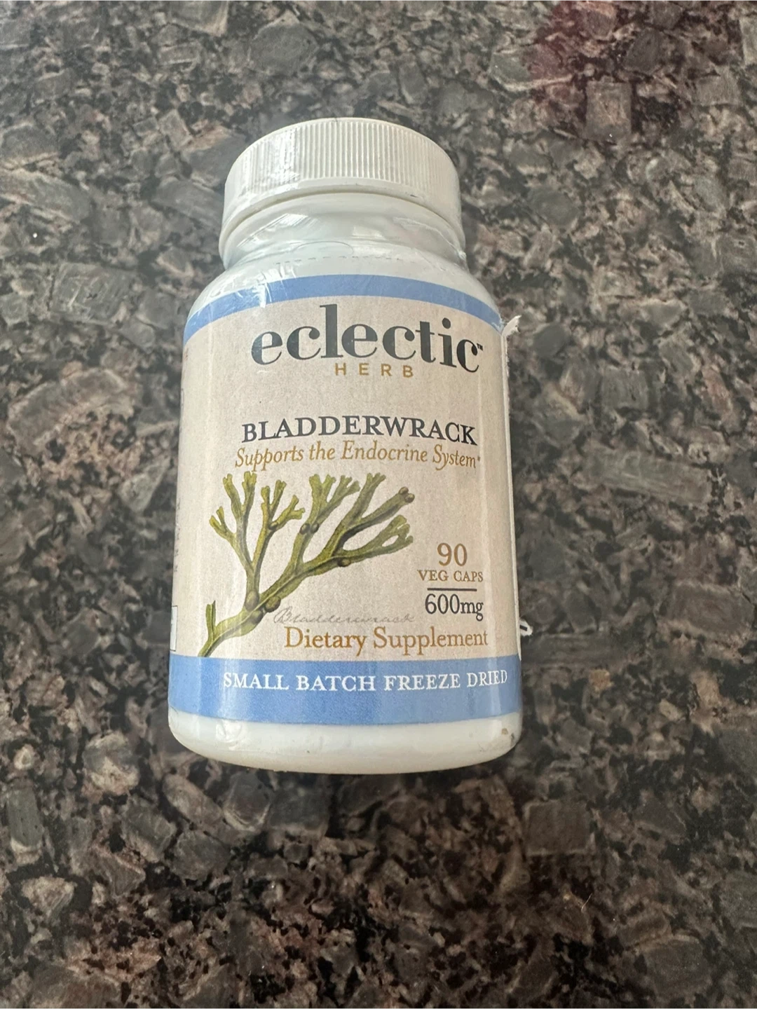 Selling a bottle of Eclectic Herb Bladderwrack supplement. It supports the endocrine system and contains 90 veg caps, each with 600mg. It's a dietary supplement that's small batch freeze dried. Perfect for anyone looking to support their overall health!