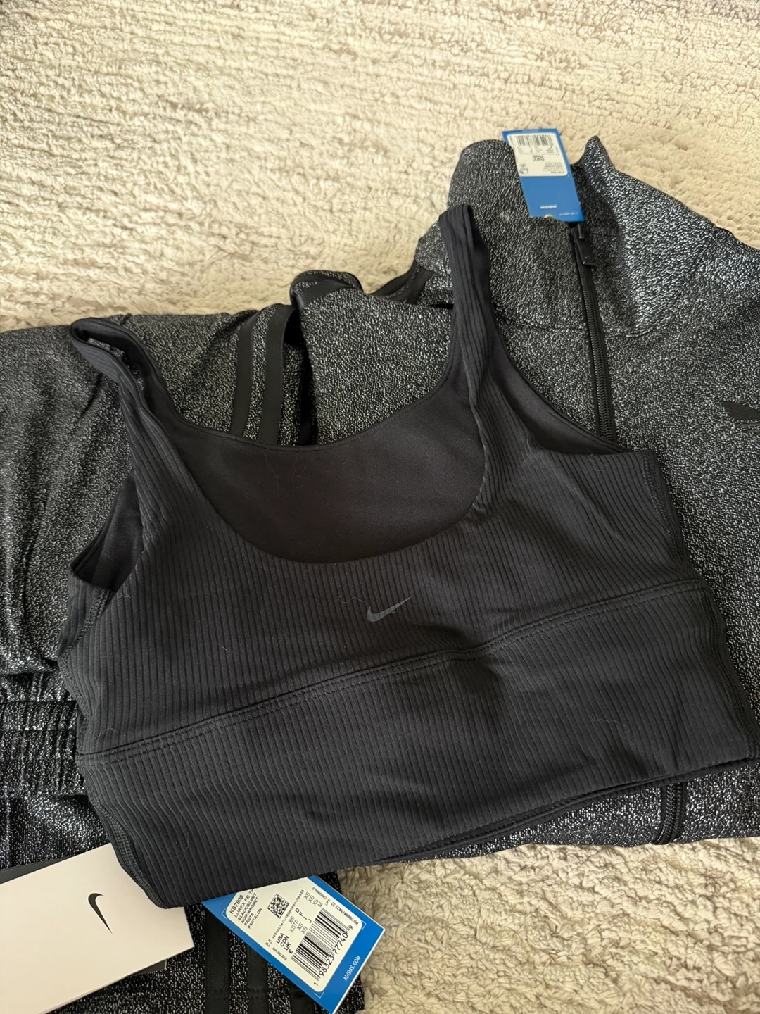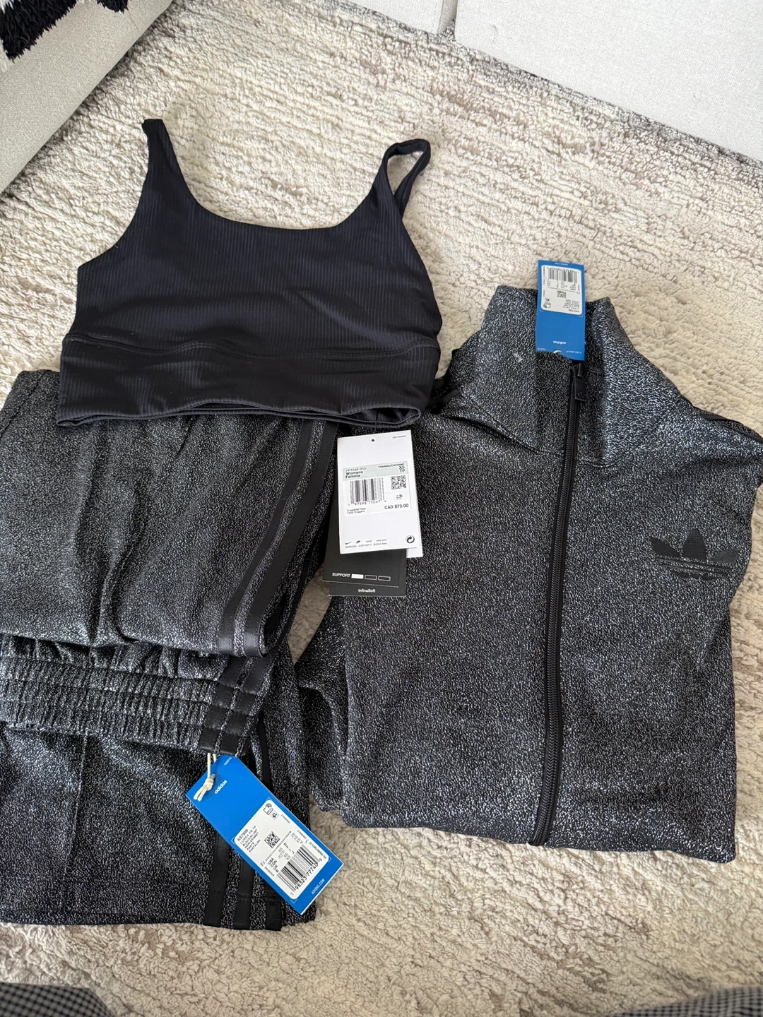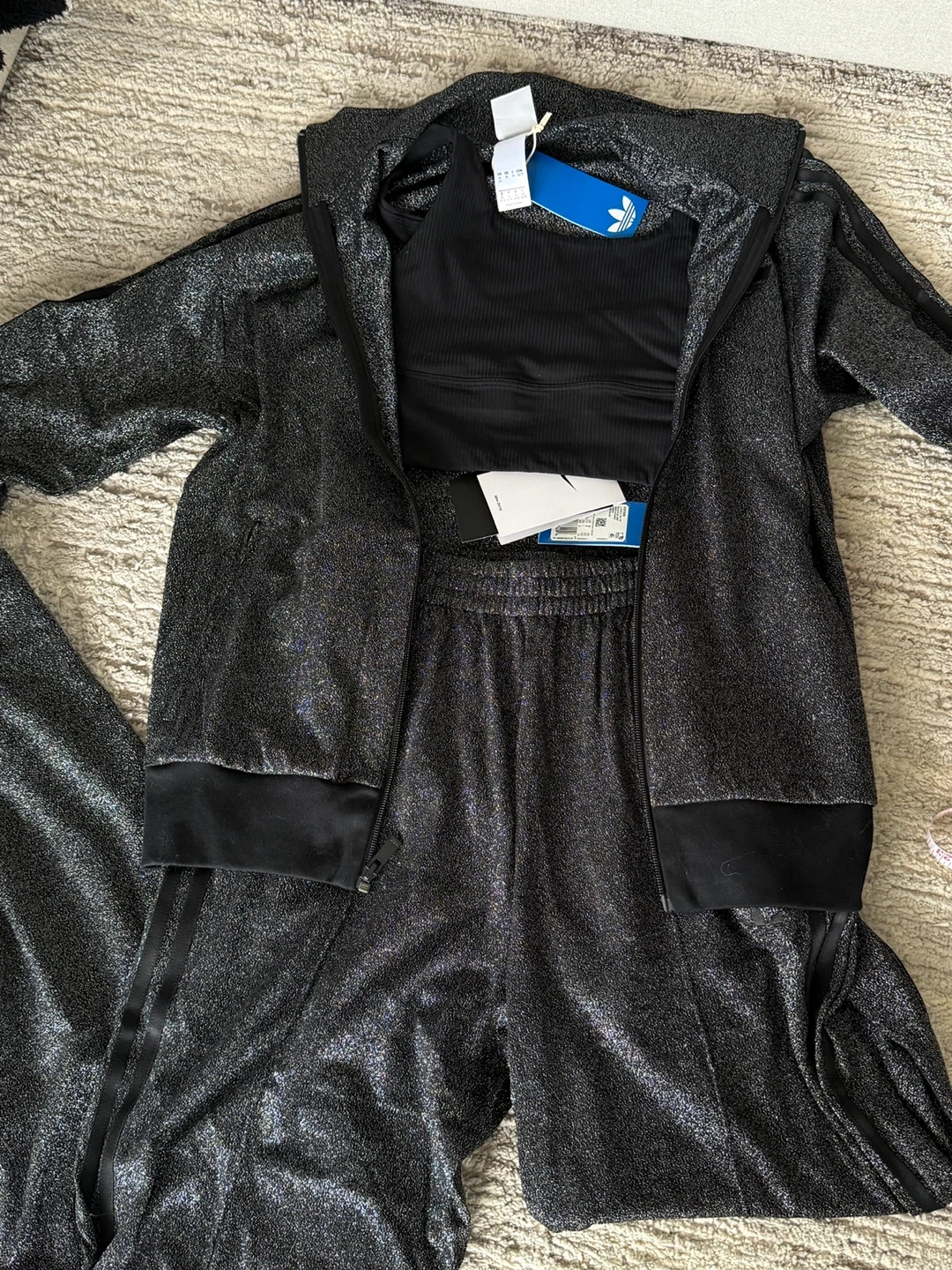 This is a brand new Adidas tracksuit set with tags. It includes a zip-up jacket and matching pants in a sparkly grey material. A black Nike sports bra is also included. This outfit is perfect for workouts or casual wear!