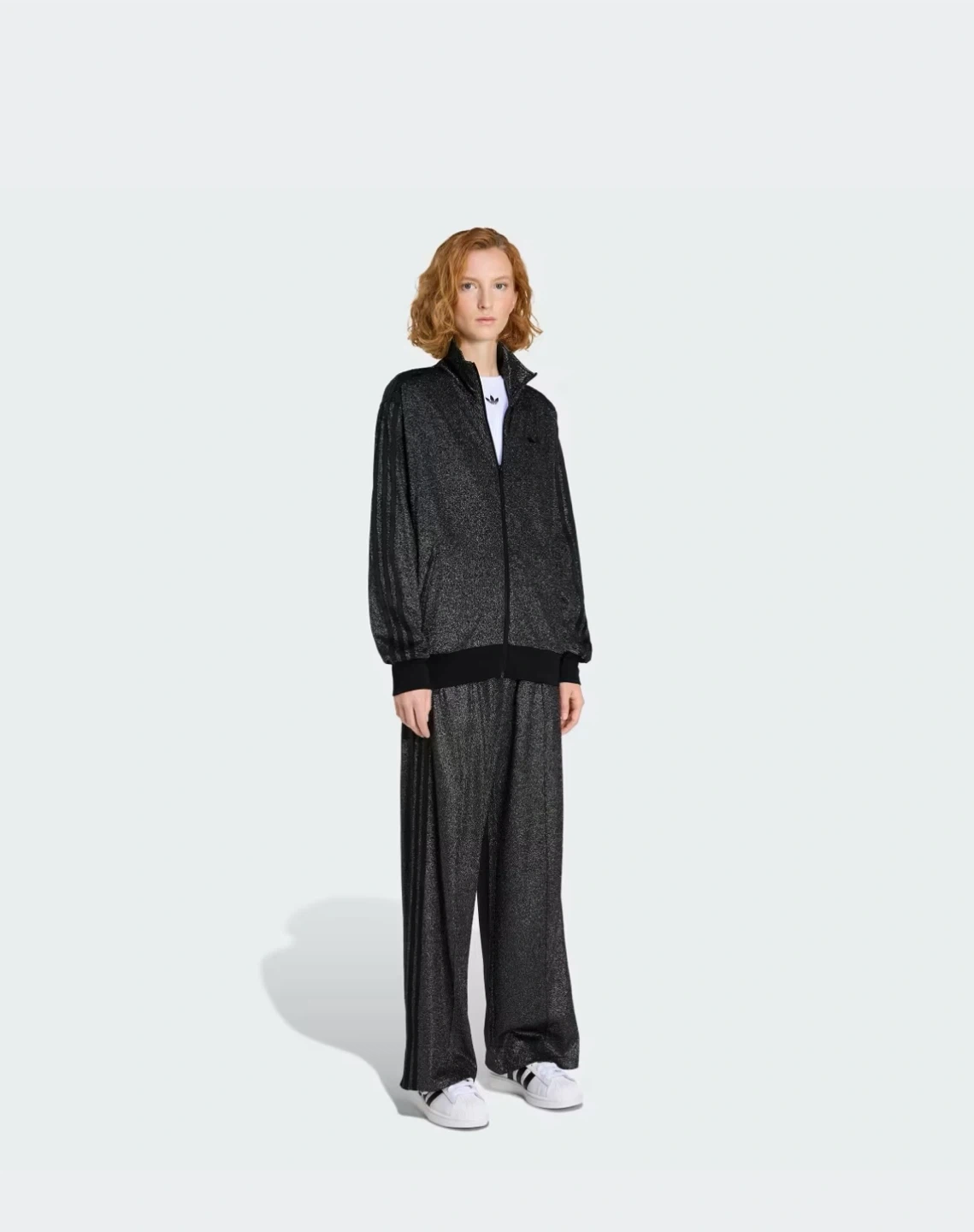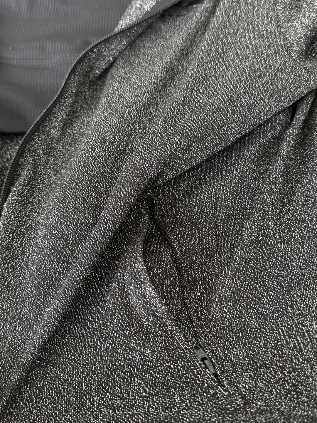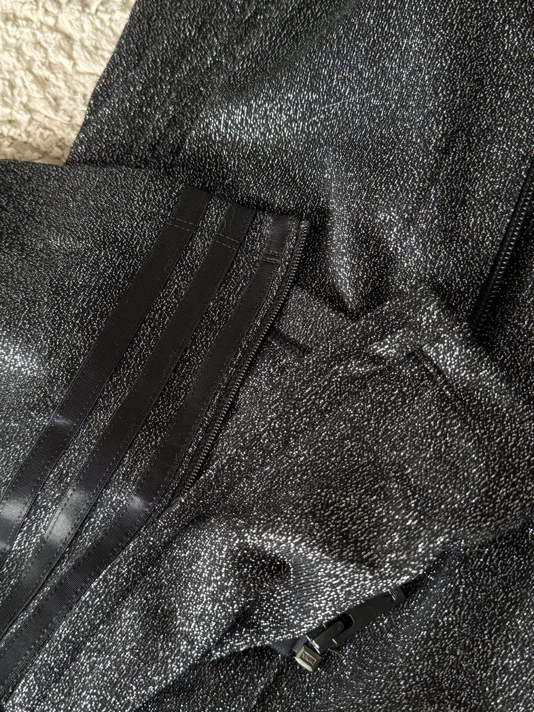 This is a brand new Adidas tracksuit set with tags. It includes a zip-up jacket and matching pants in a sparkly grey material. A black Nike sports bra is also included. This outfit is perfect for workouts or casual wear!