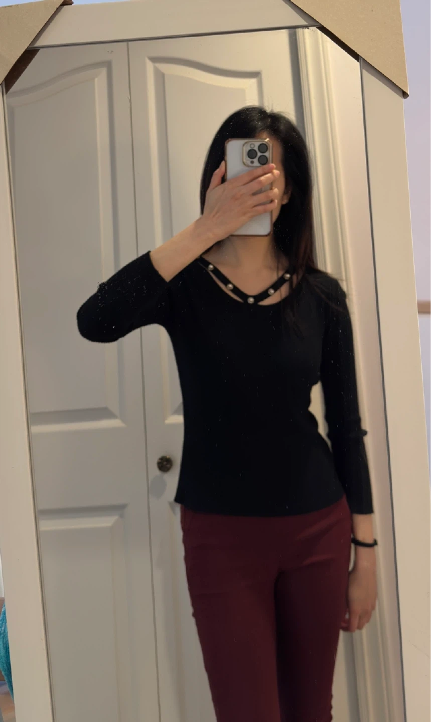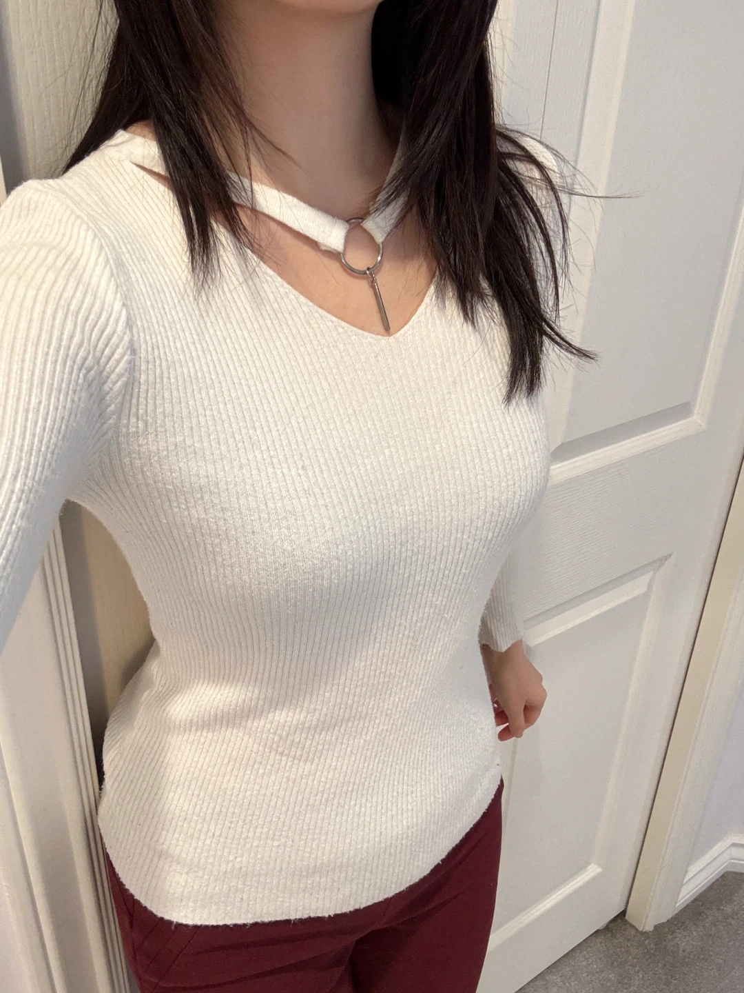 This is a white, long-sleeved, ribbed knit top. It features a V-neck with a decorative metal ring detail. The material is stretchy and comfortable. Perfect for casual wear!