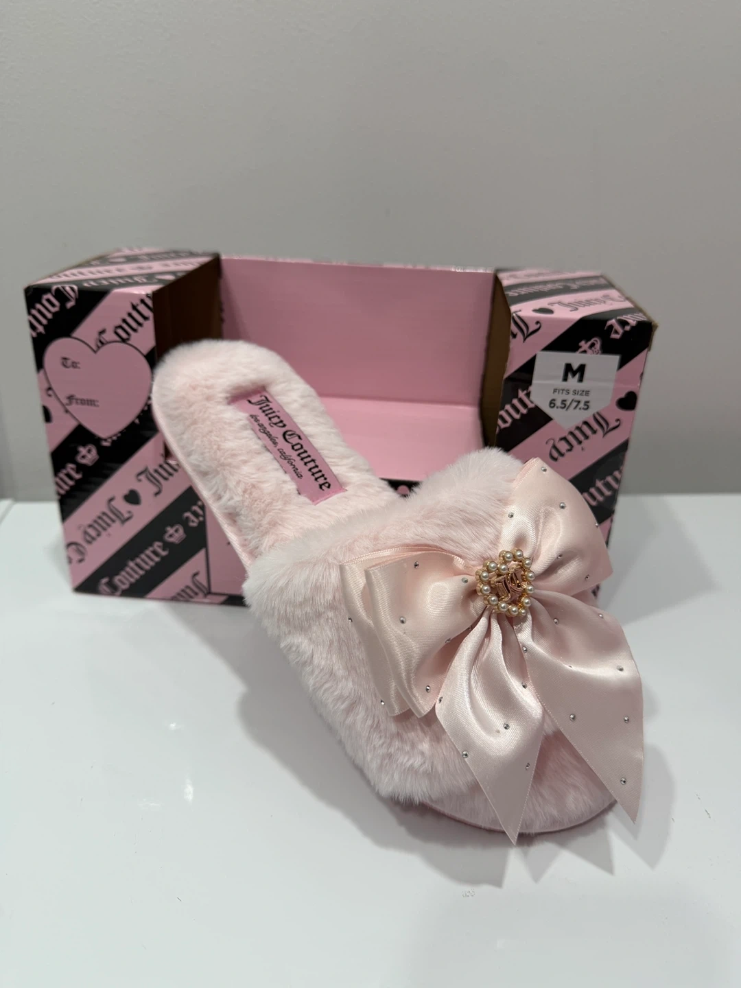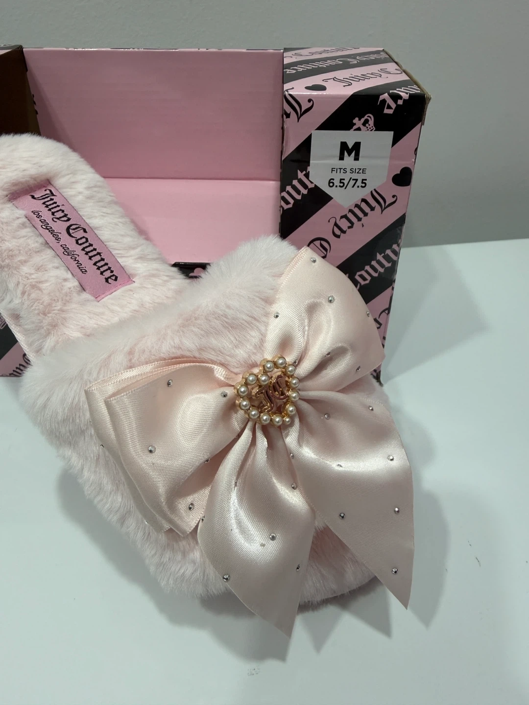 Super cute Juicy Couture slippers in a light pink colour! They feature a lovely satin bow with pearl and rhinestone accents. Size M, which fits sizes 6.5/7.5. Comes with the original box!