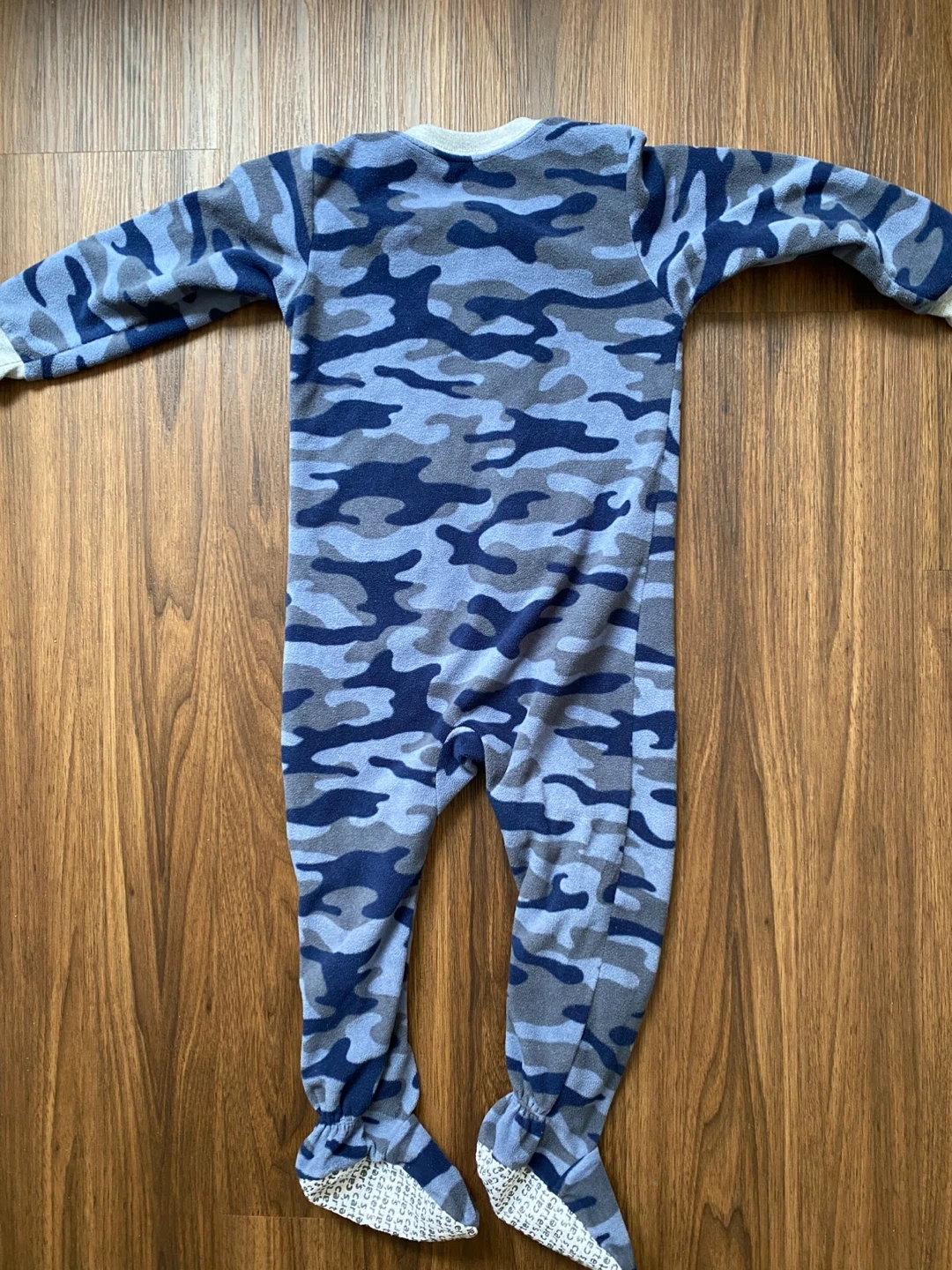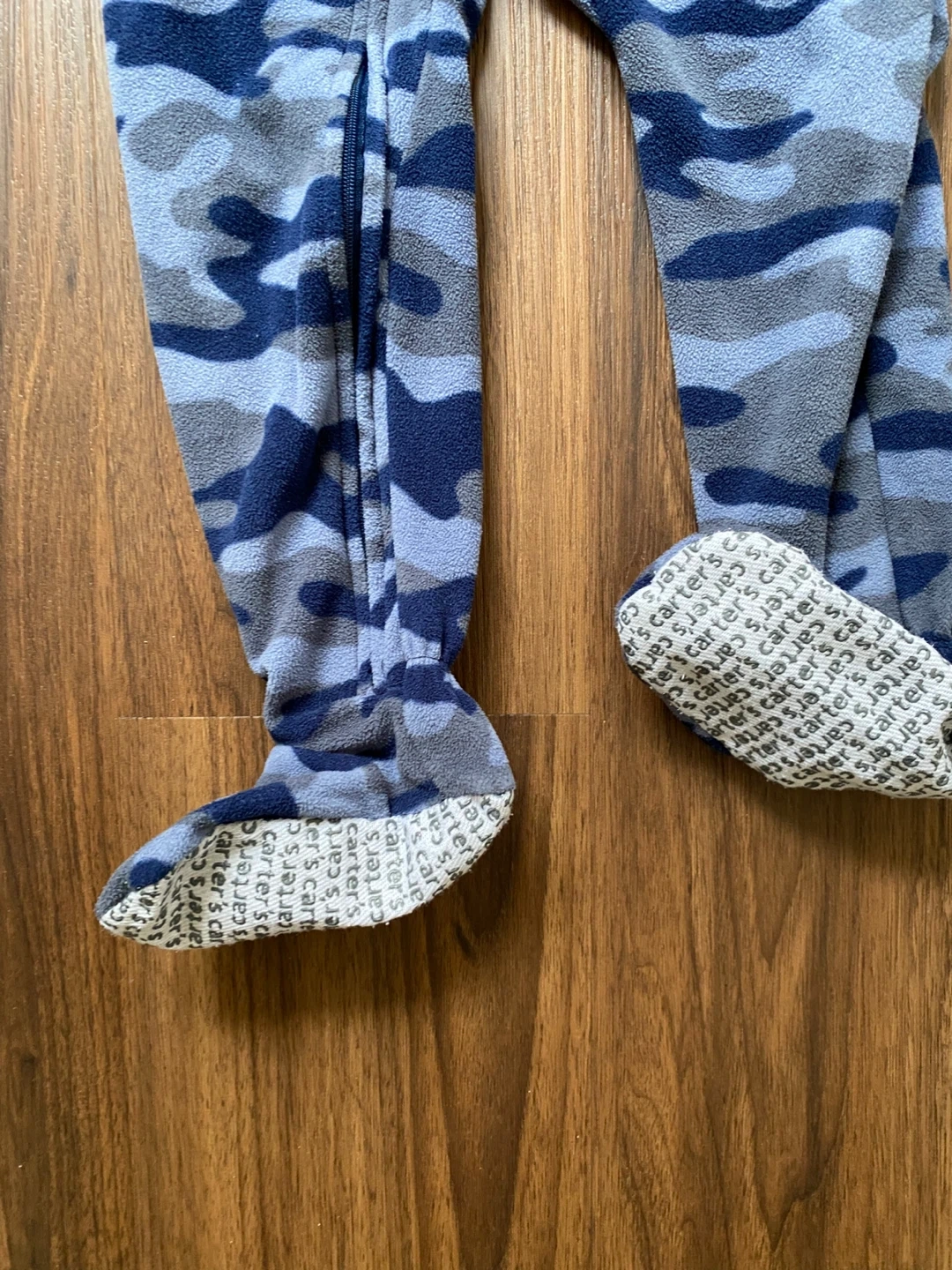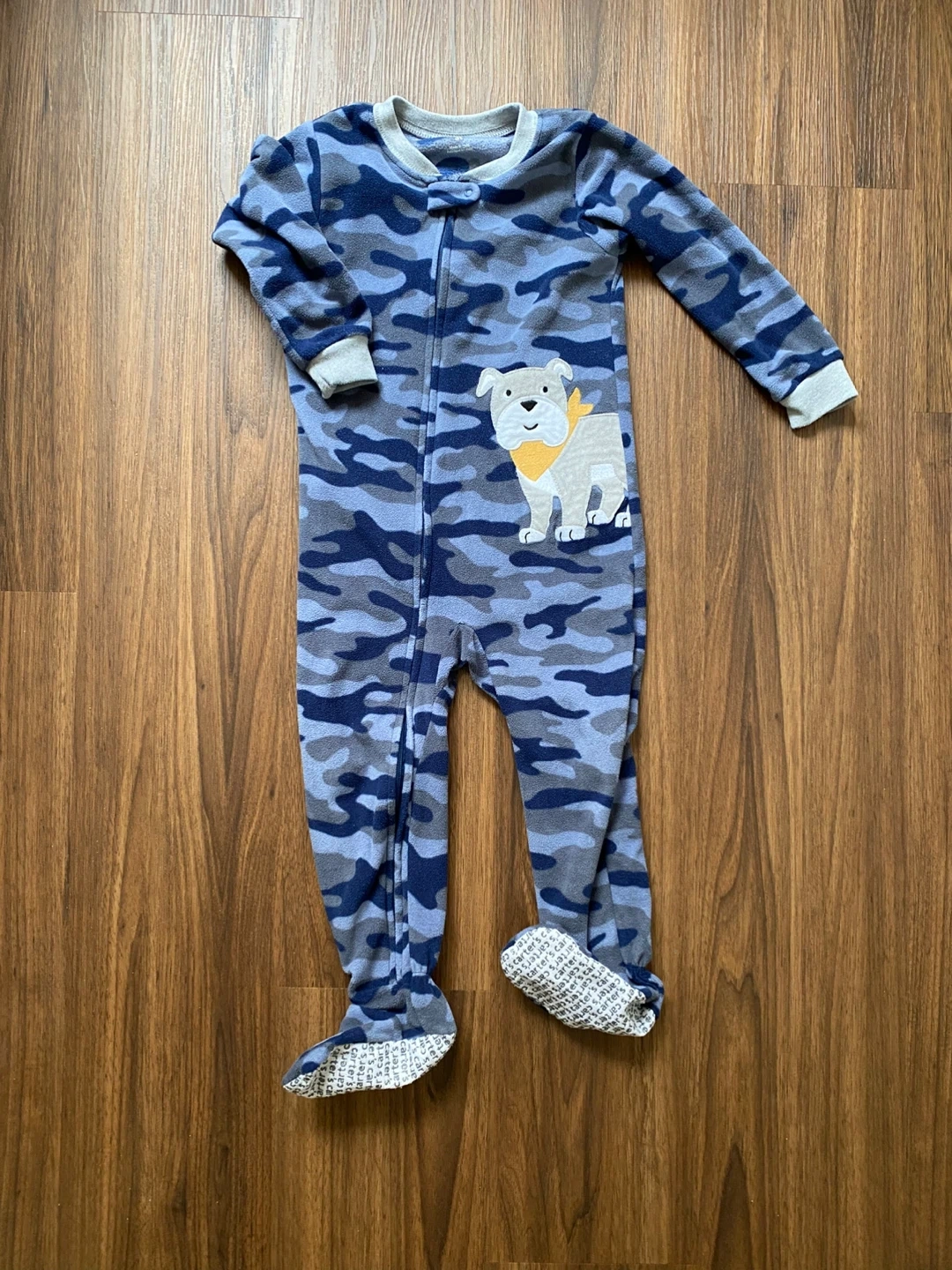 Cozy Carter's fleece footed pajamas in a blue camouflage print. Features an adorable bulldog applique on the chest. Zipper front for easy on and off. Non-slip grips on the feet.