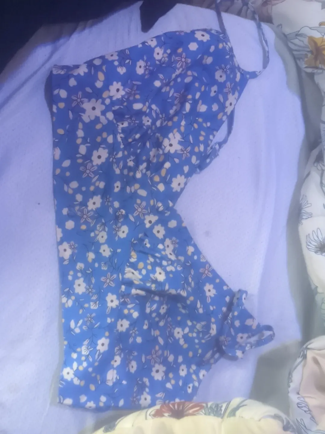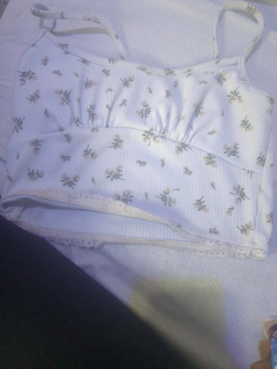 Blue floral crop top, size L. White floral ribbed crop top, size M. Both from SHEIN. Lightweight and perfect for warm weather!