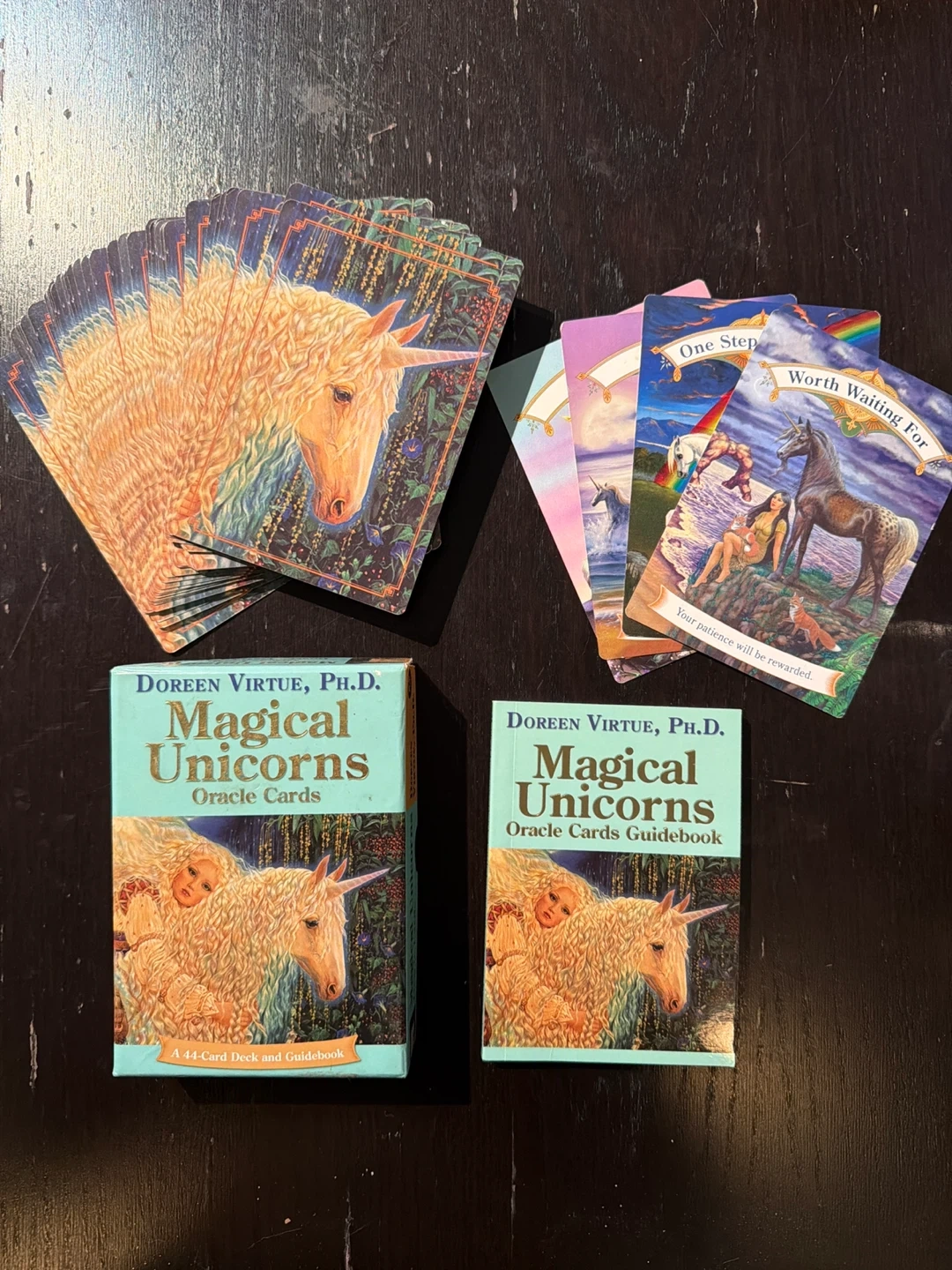 This is the Magical Unicorns Oracle Cards deck and guidebook by Doreen Virtue, Ph.D. It includes a 44-card deck and an accompanying guidebook. The cards feature beautiful unicorn imagery and guidance messages.