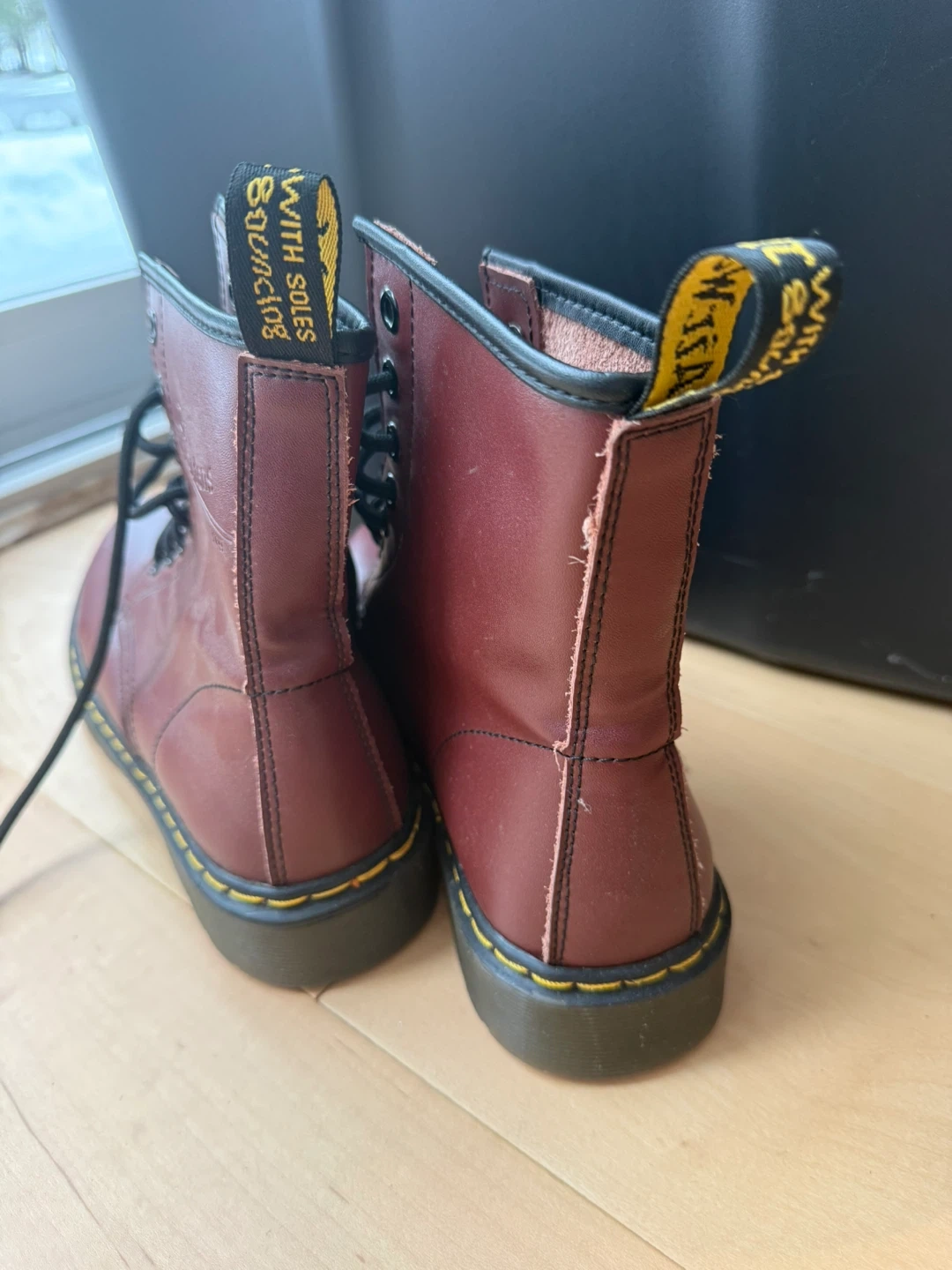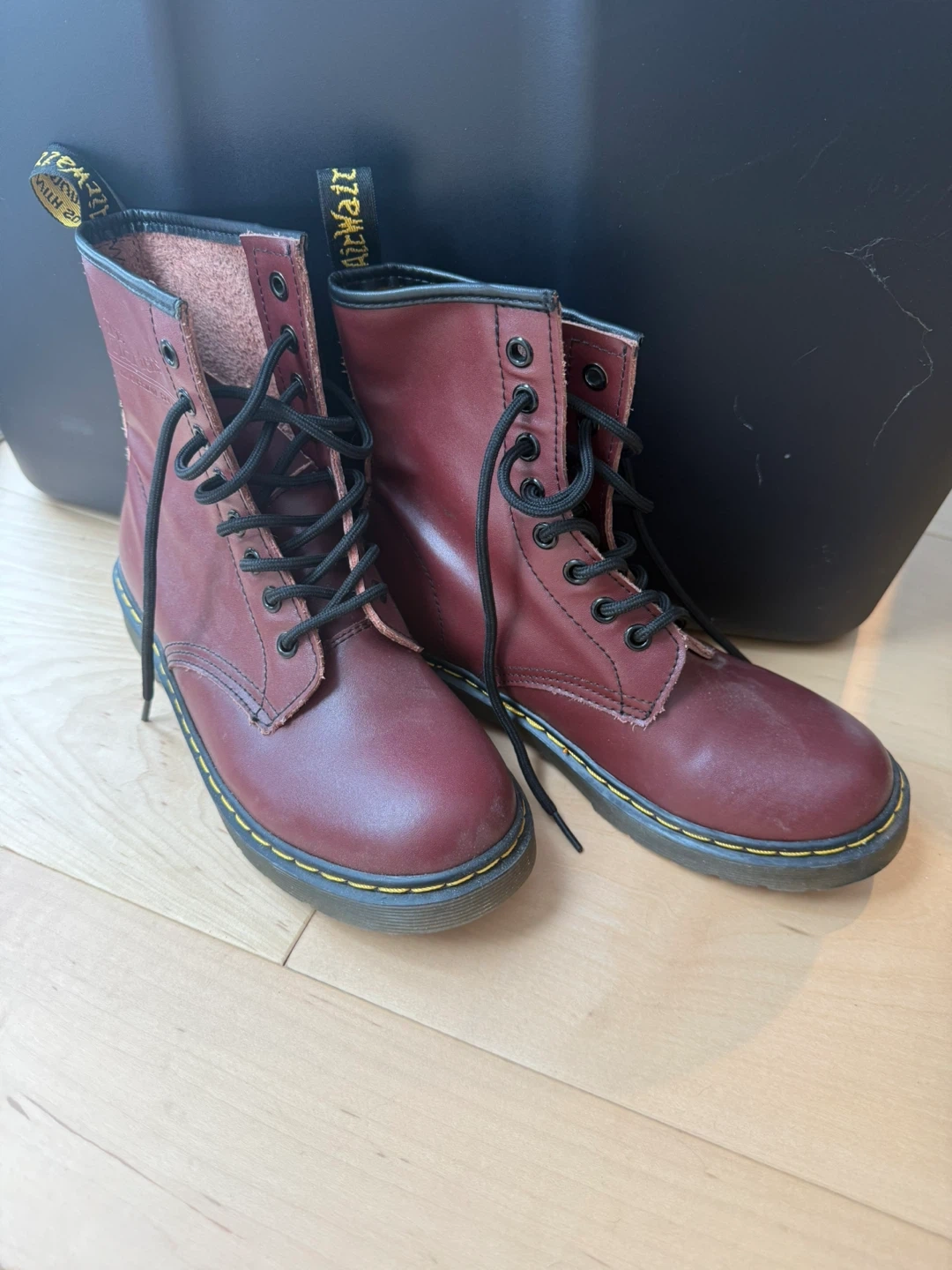 These are burgundy leather Dr. Martens 1460 boots. They're a size EU 37, UK 4, USL 6, and 235mm. Made in China.