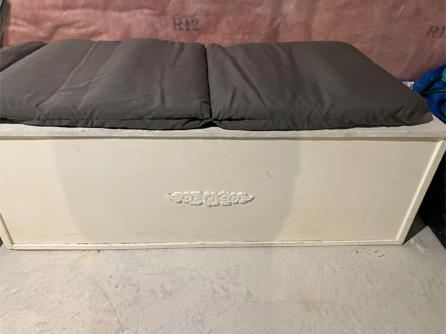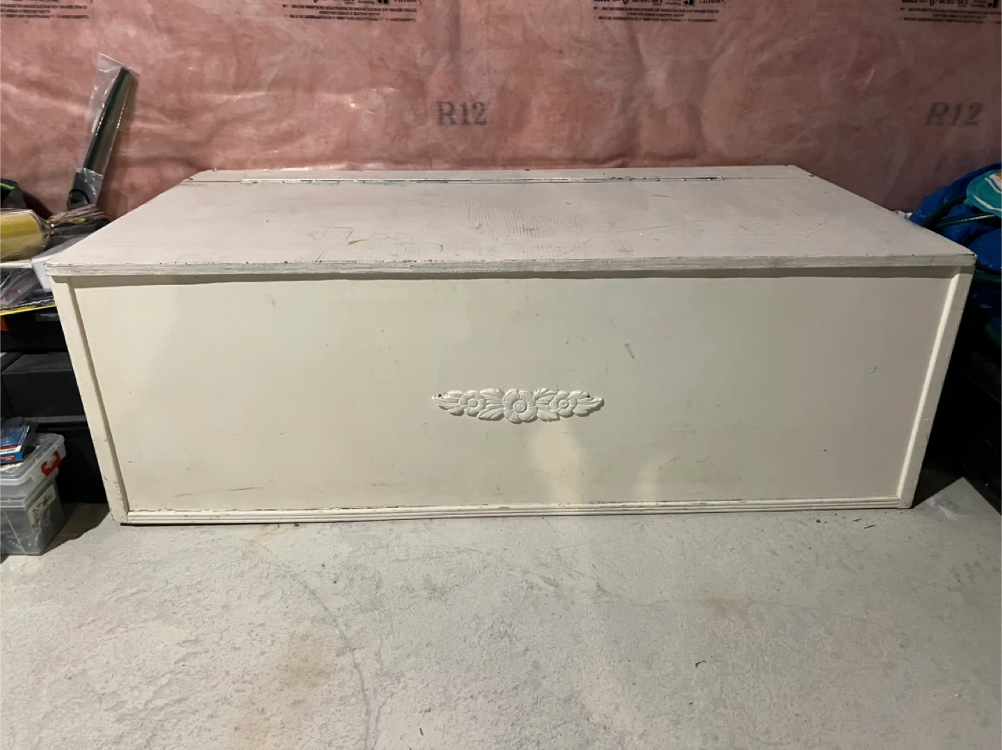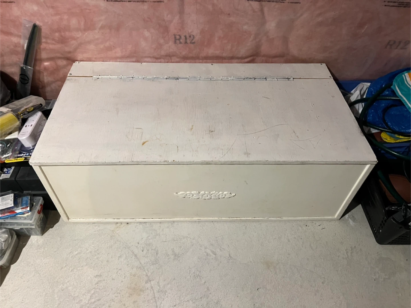 A solid storage bench made of plywood and features a hinged lid for easy access. This chest offers ample space for blankets, toys, tools or other household items. It's perfect for stowing away clutter in a bedroom, living room, or entryway. Can be used as a bench.