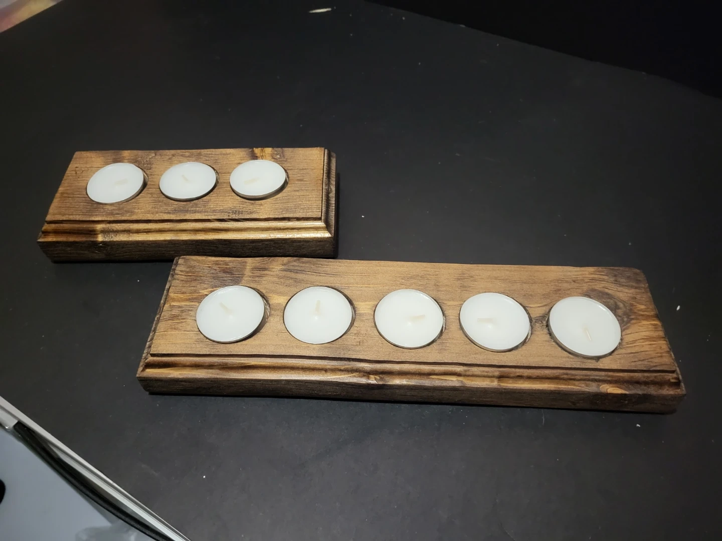 Two handcrafted wooden candle holders. One holds three tea lights, and the other holds five tea lights. These rustic holders are made of stained wood.The large are $4, the small are $3.