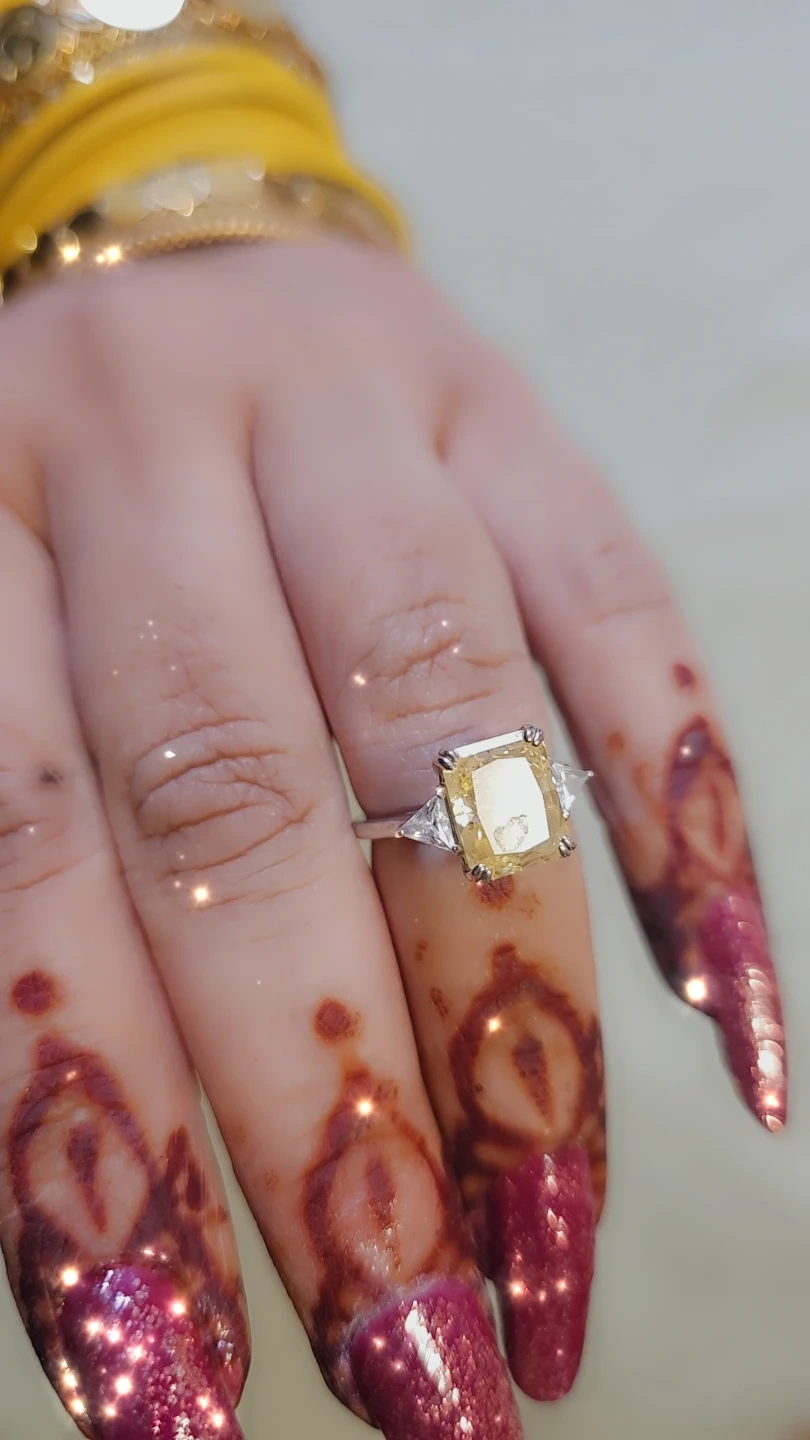 A beautiful engagement ring featuring a radiant-cut yellow centre stone, flanked by two triangular accent stones. The setting appears to be white gold or platinum. This ring is a stunning piece for a special occasion.