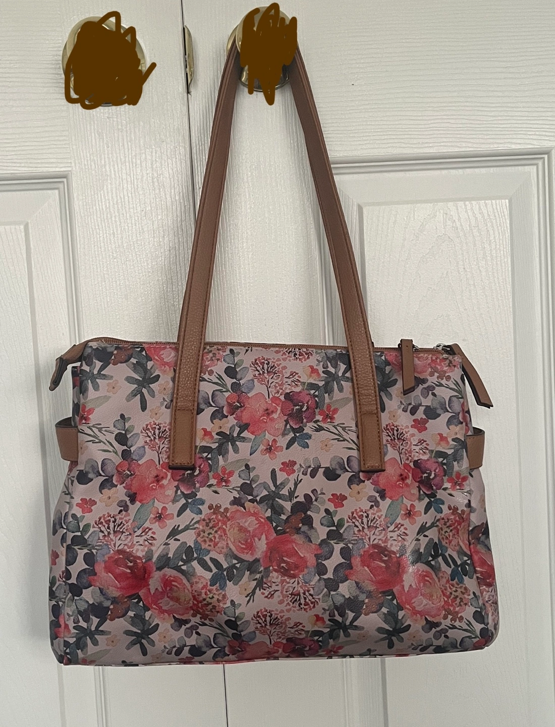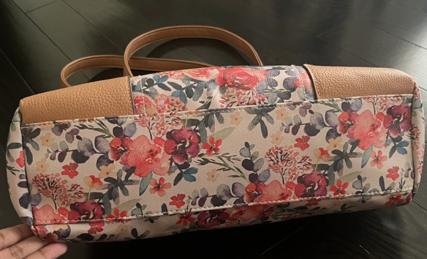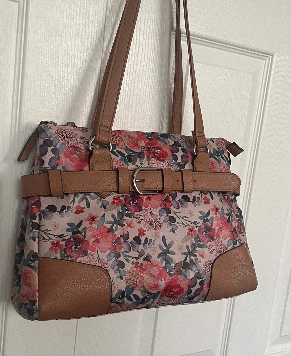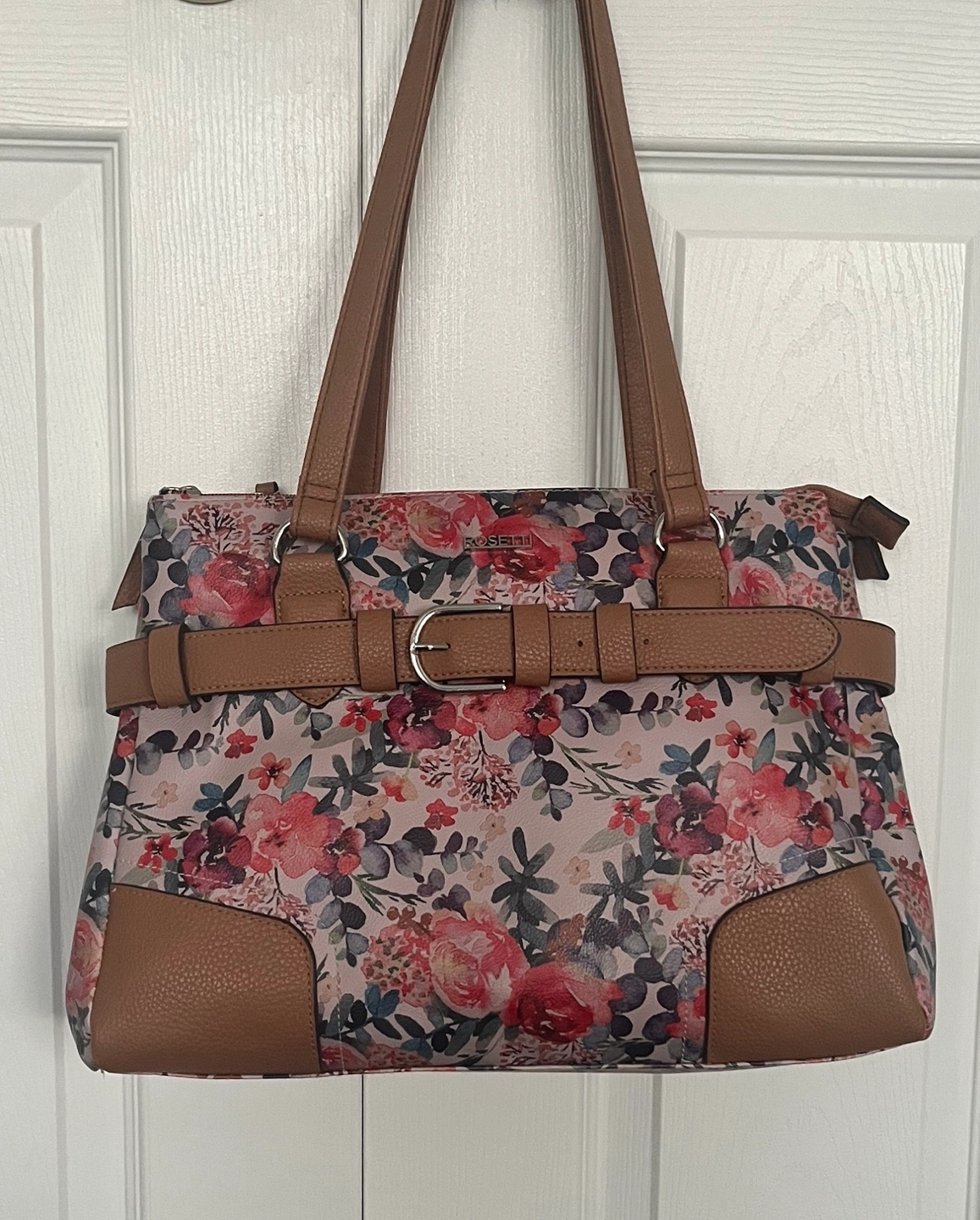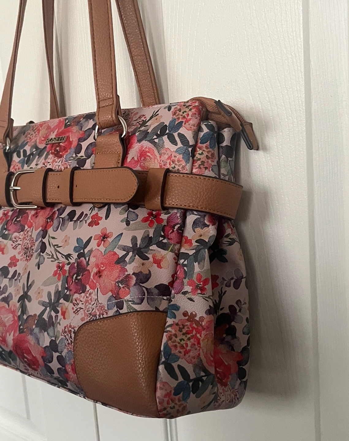 Floral handbag with a brown belt, two top handles for shoulder bag.