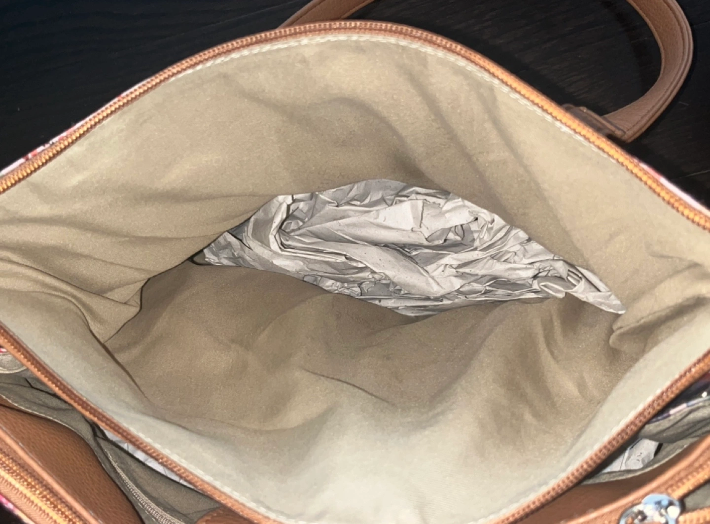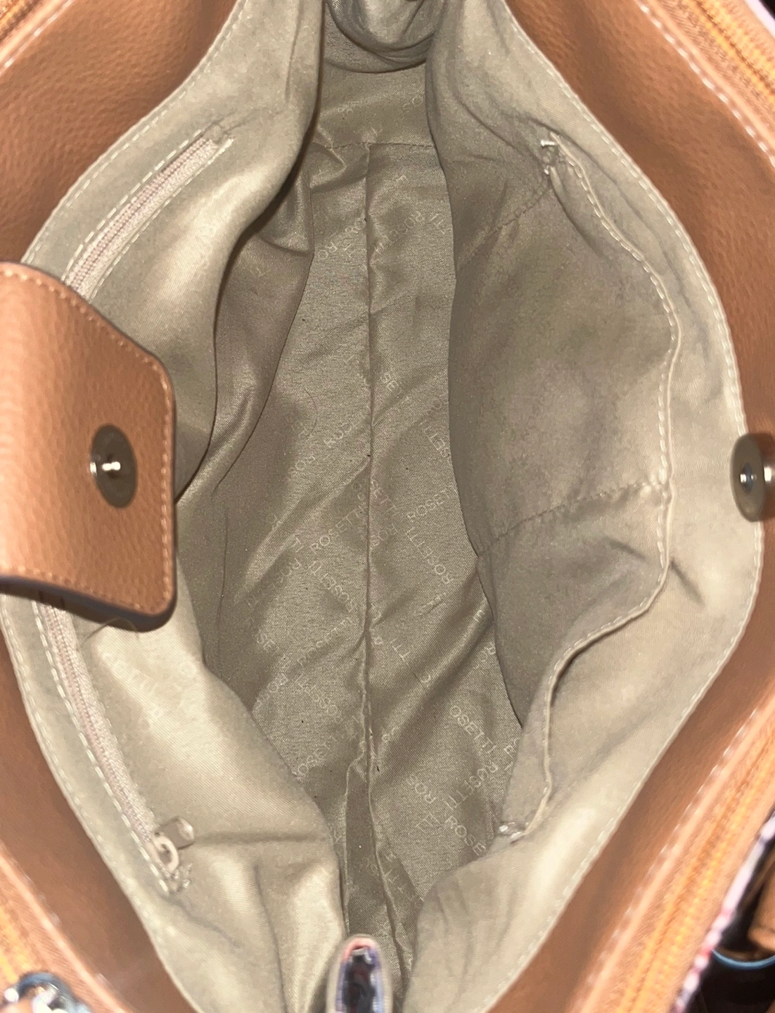 Middle compartment with snap closure and has an Interior zip pocket and 2 open pockets.