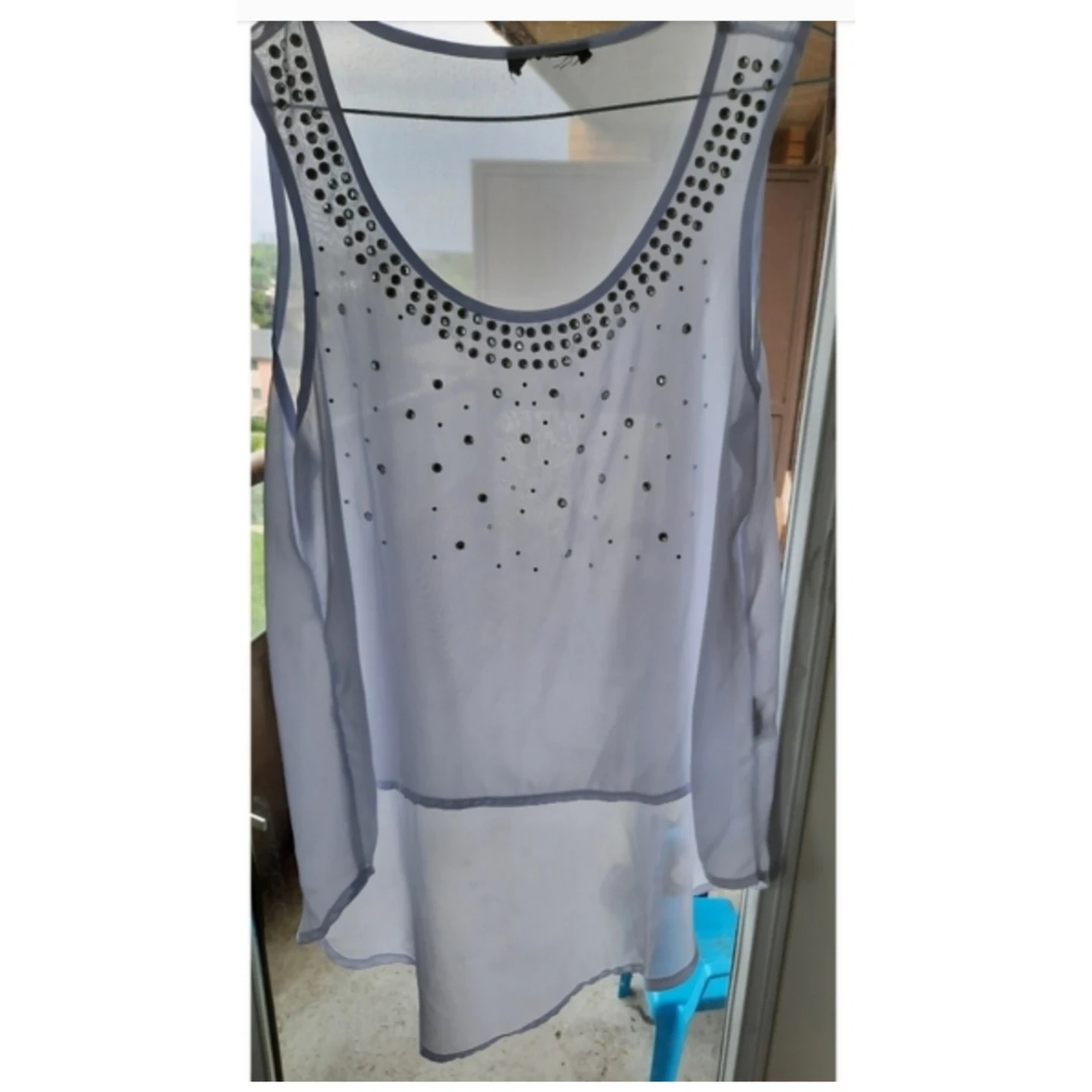 Lightweight sheer top with a round neckline. Features sparkling embellishments around the neckline and scattered on the front. It's a stylish piece for layering.