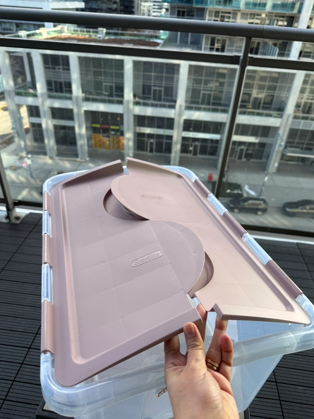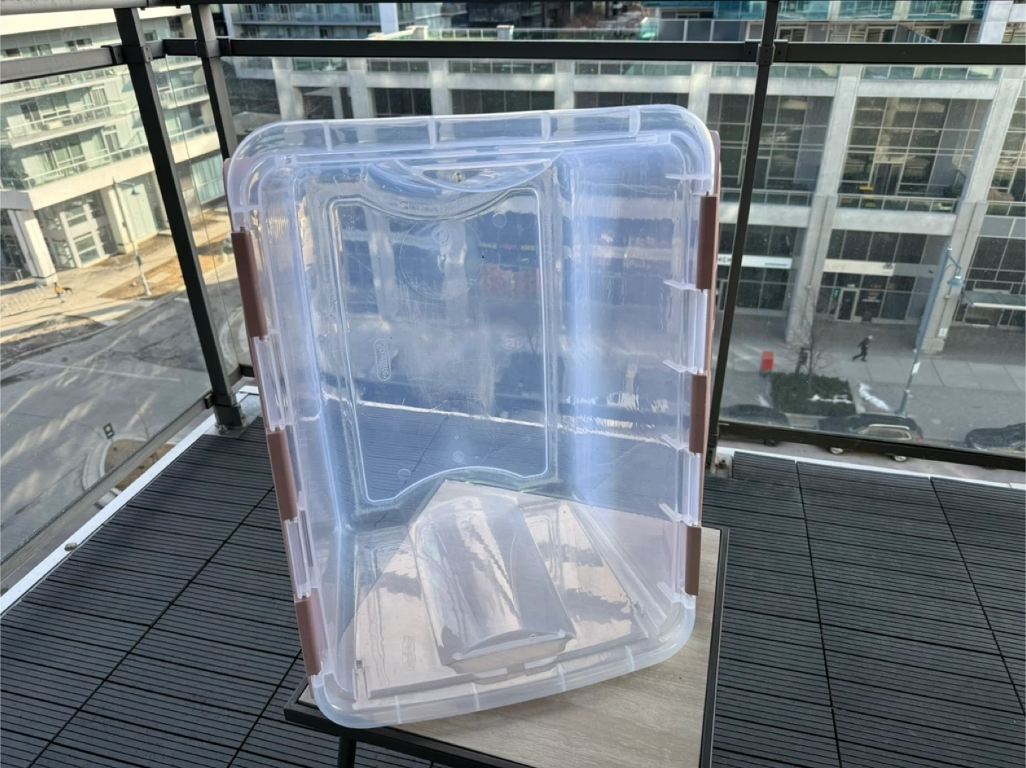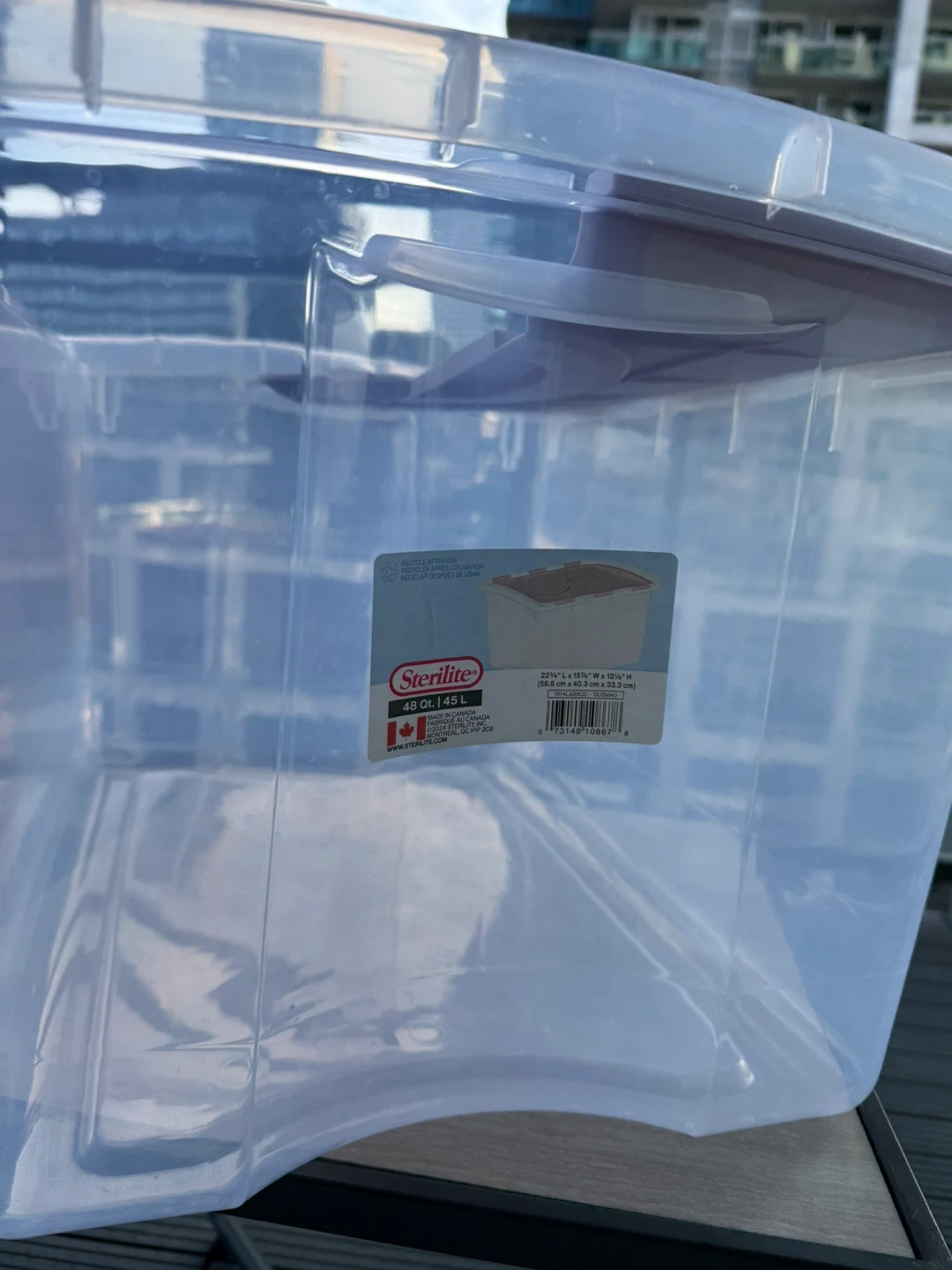 This is a Sterilite 48 Qt clear storage bin with a brown lid. It's made of durable plastic and includes latches to secure the lid.