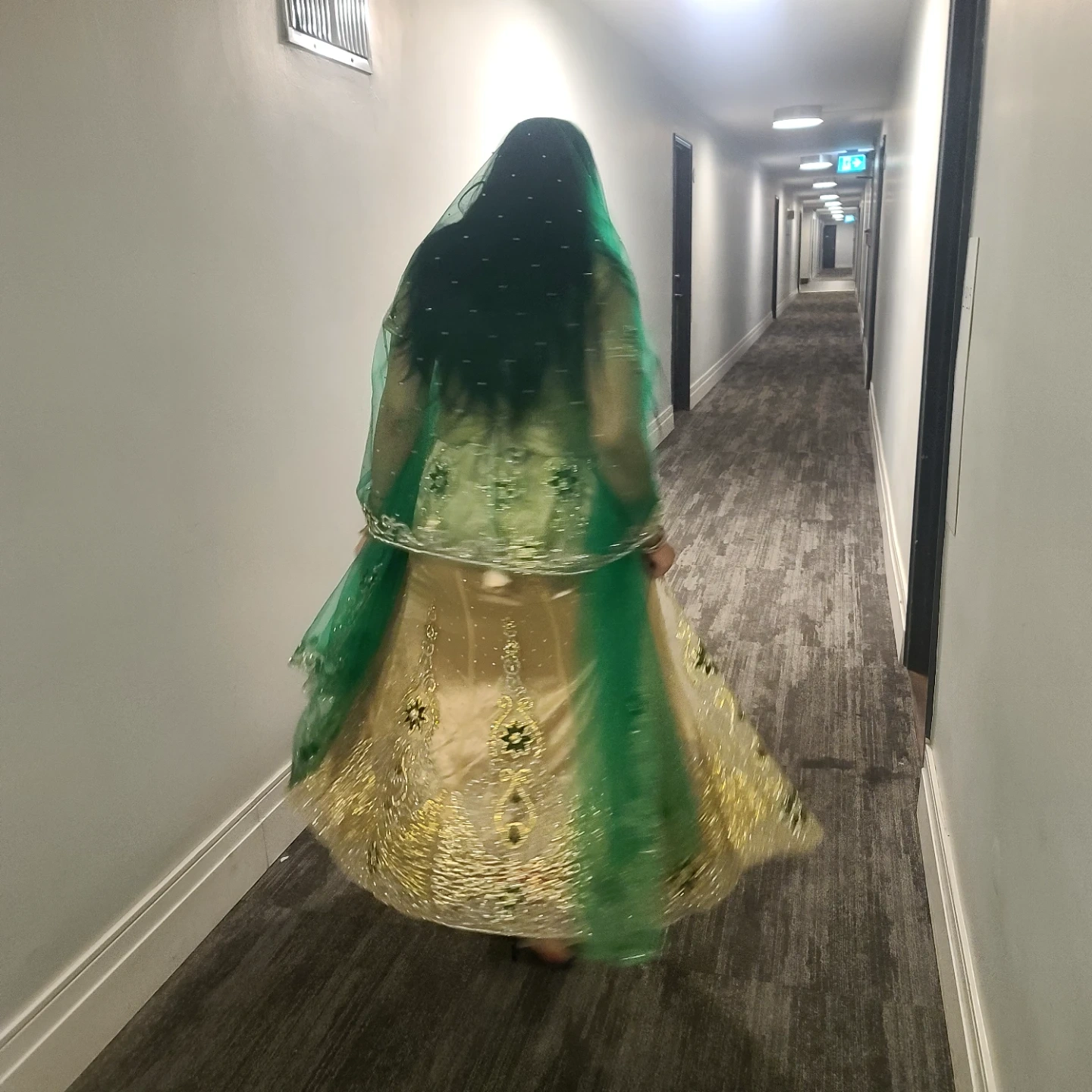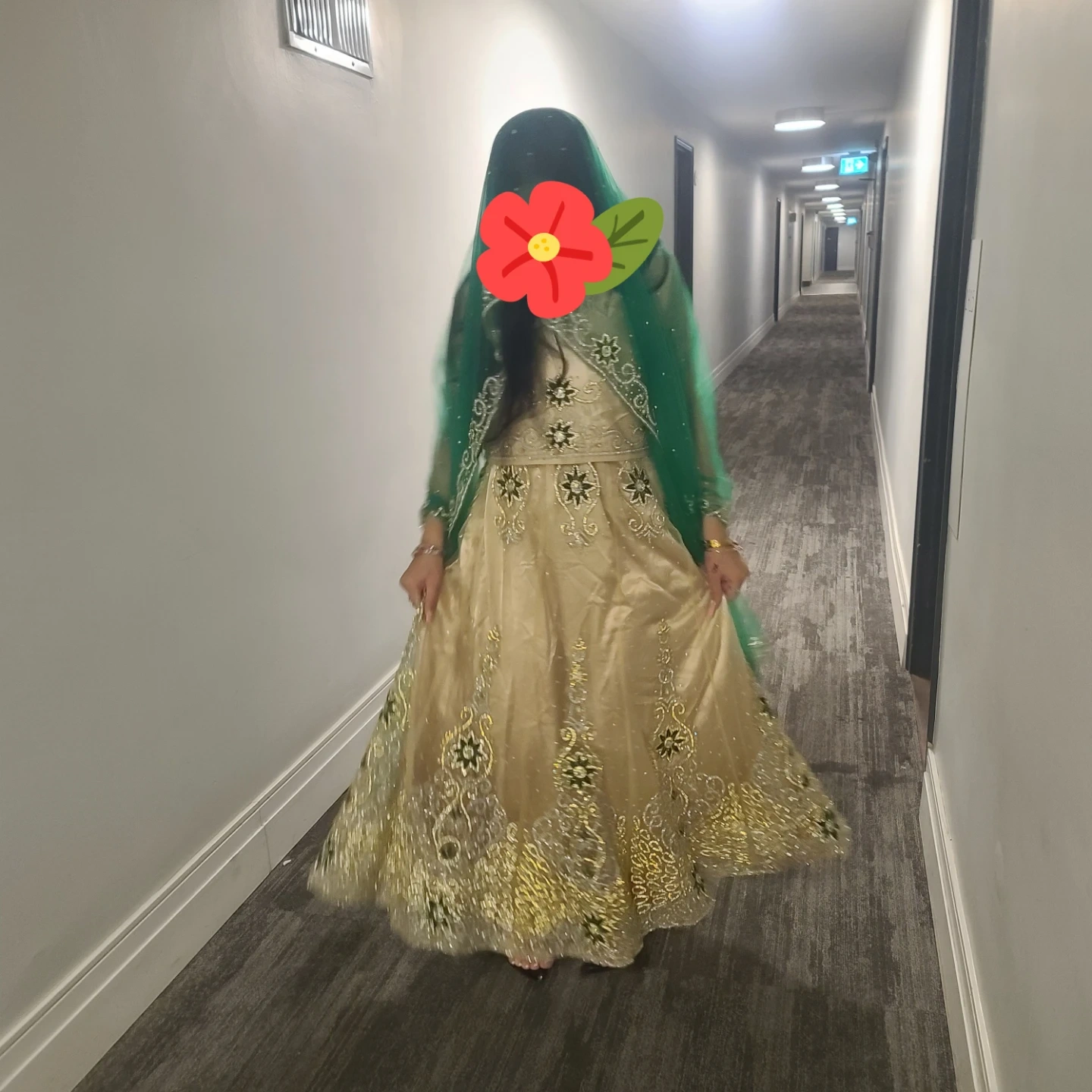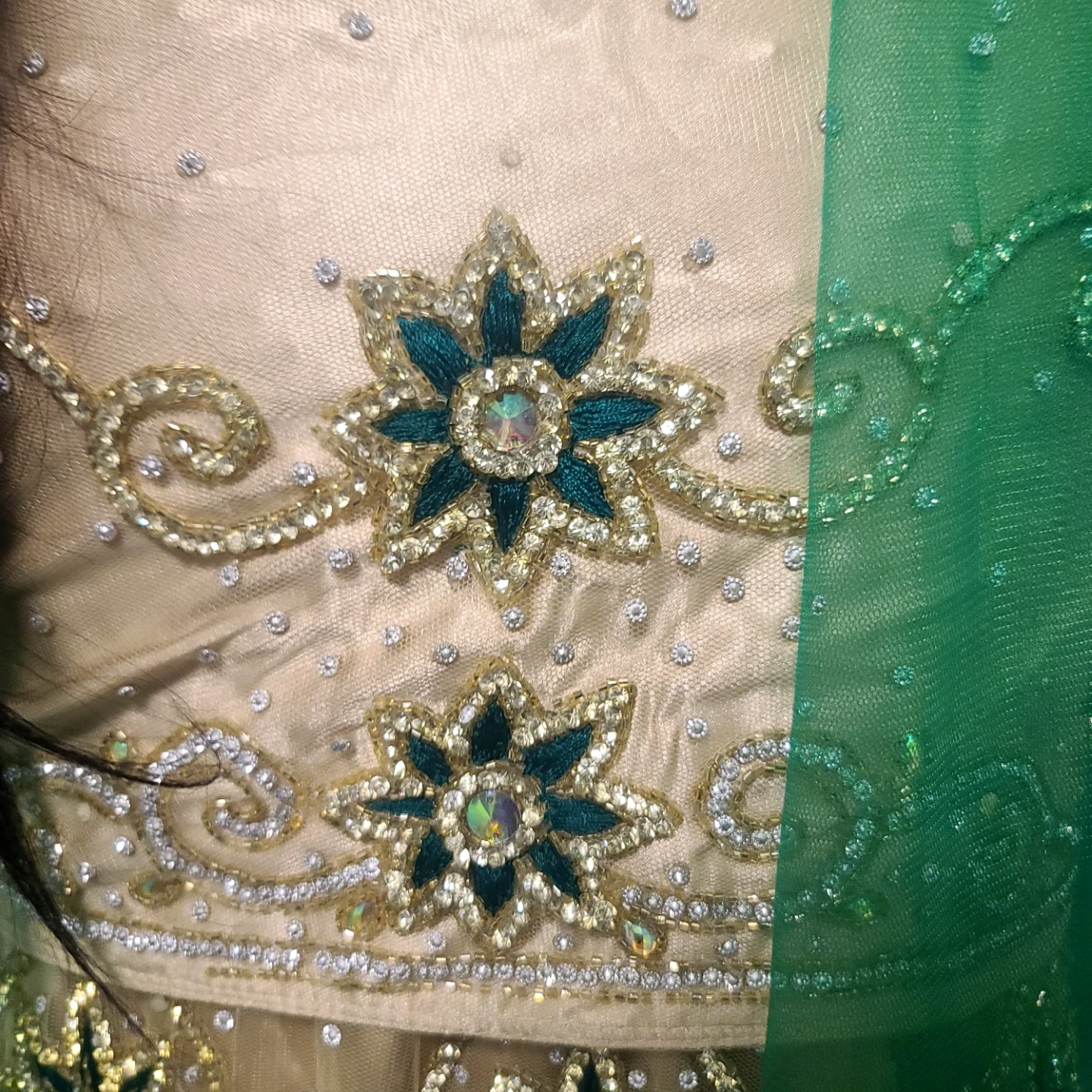 Beautiful lehenga choli set with intricate embroidery and a matching dupatta. Perfect for special occasions! The set features a gold-toned skirt and top with green and gold embroidery, paired with a sheer green dupatta. It's in great condition and ready to wear
