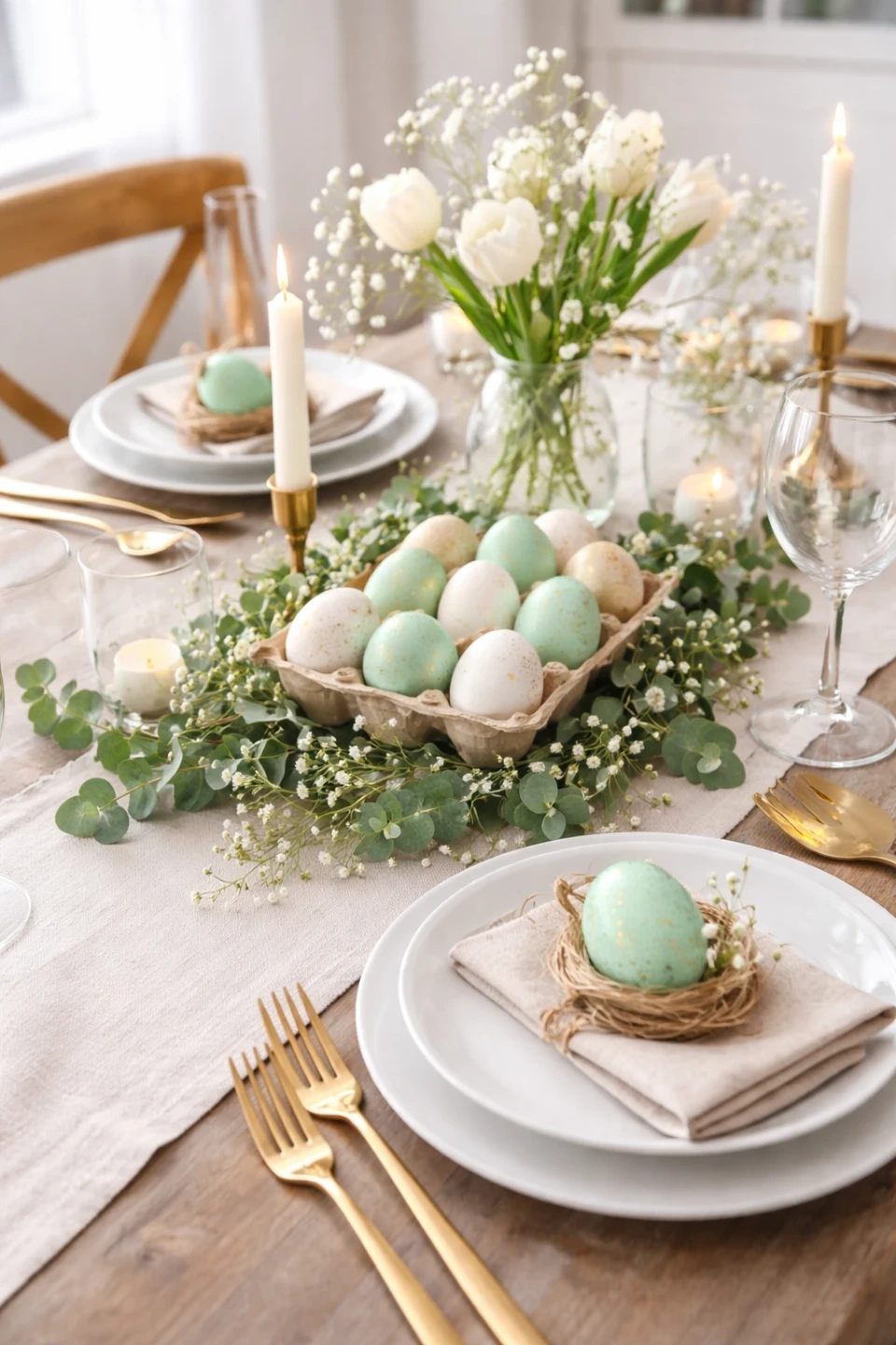 A set of 12 decorative Easter eggs in a carton. Includes green and white speckled eggs with gold accents. These eggs are ideal for Easter decorating.