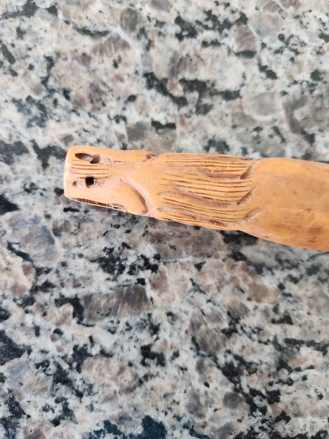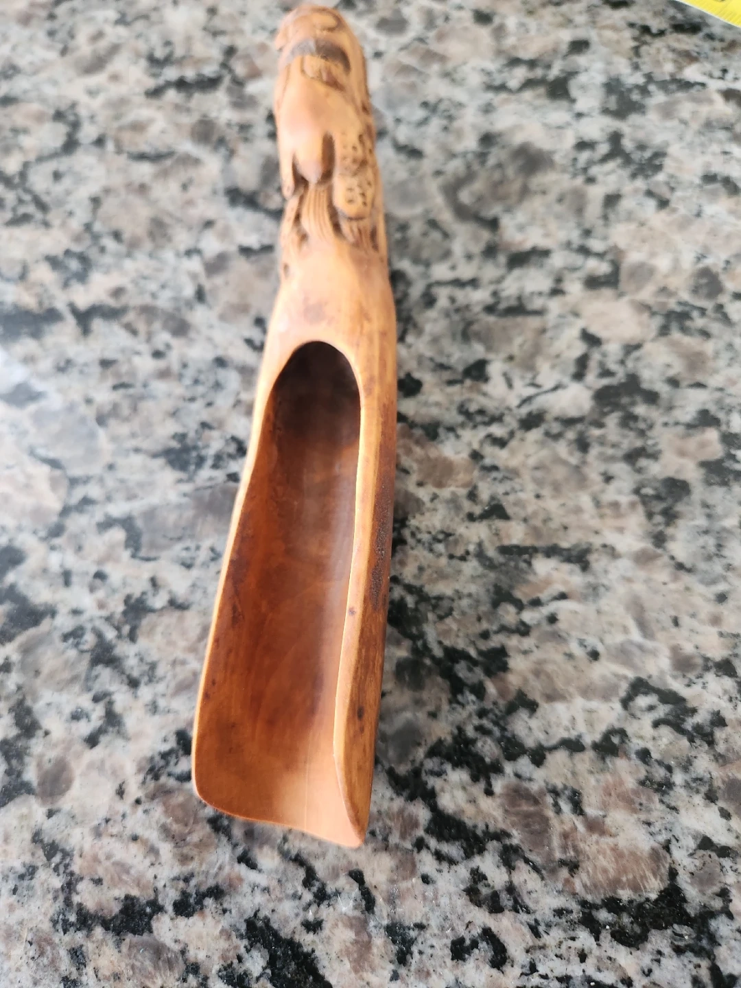 This is a unique wooden scoop carved with a dragon design. It measures about 6 inches long. Its artisanal look makes it a neat display piece for any tea or coffee lover!