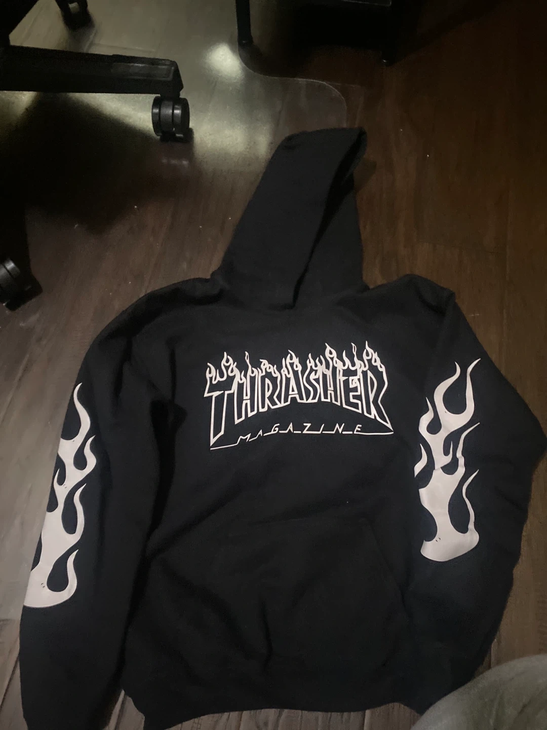 Black Thrasher Magazine hoodie with flame graphics on sleeves. Cotton/polyester blend. Size L, fits Youth.