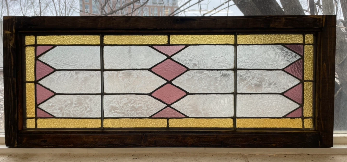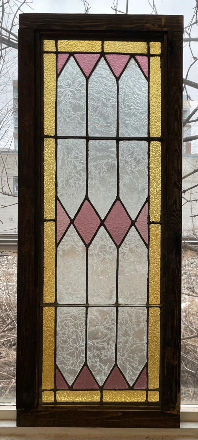 One restored vintage stained glass window panel is available! It features a beautiful design with pink, amber, and clear glass, in a dark wood frame. Perfect for adding a touch of vintage charm to your home