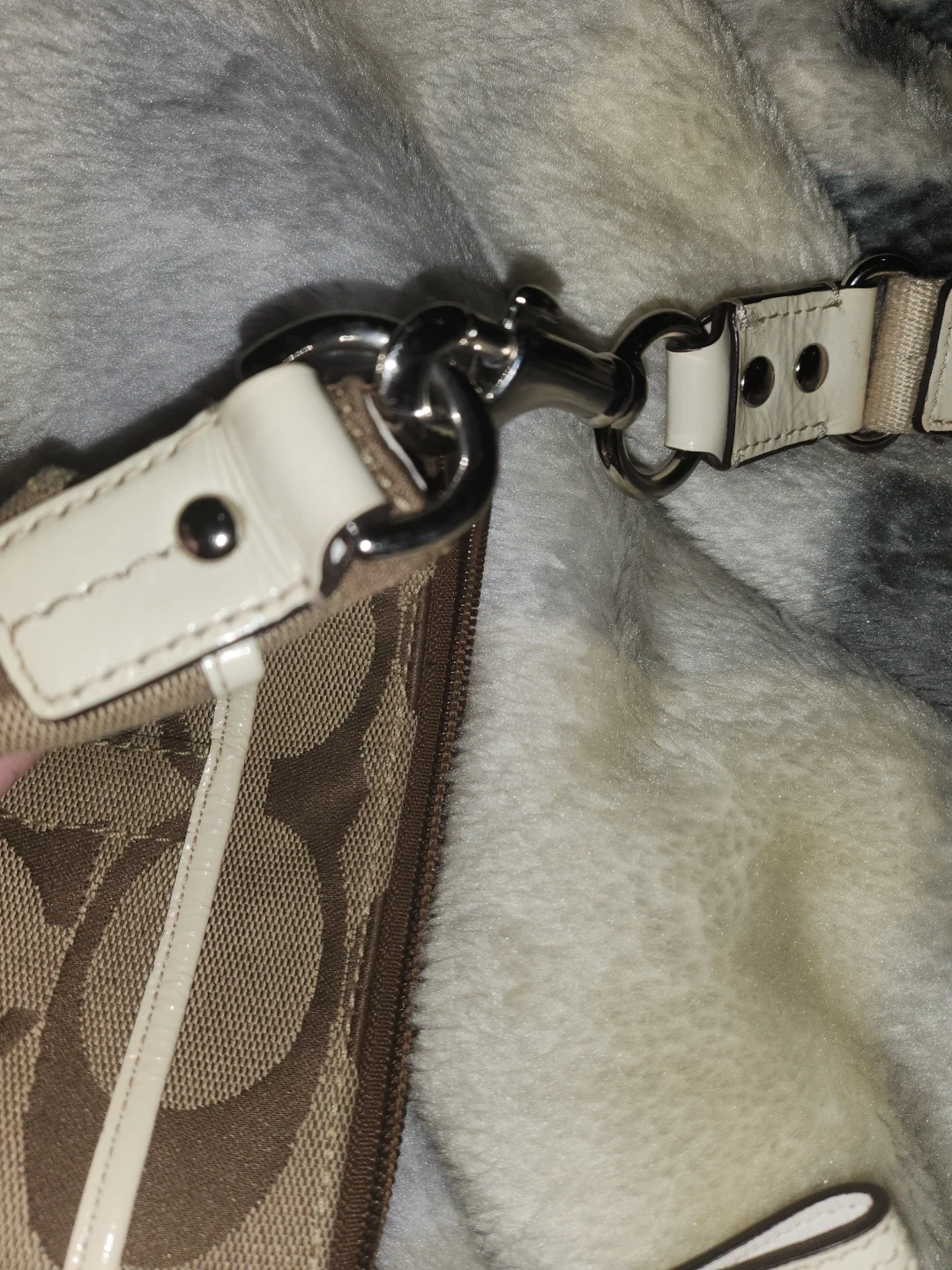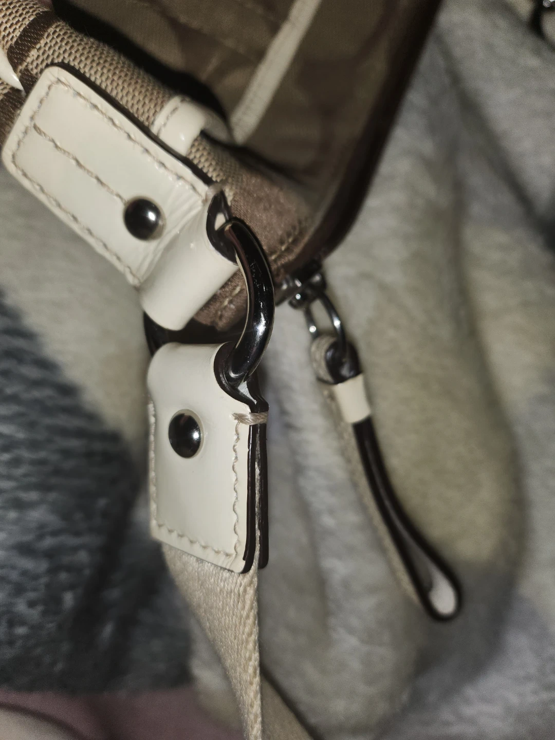 Purse needs a good cleaning on the outside, inside looks good. Has adjustable strap, zipper closure with two pockets. 99% it's not a Coach because it lacks the Coach stamp. (I have several authentic bags, no expert but I'm positive this is a knock off.)