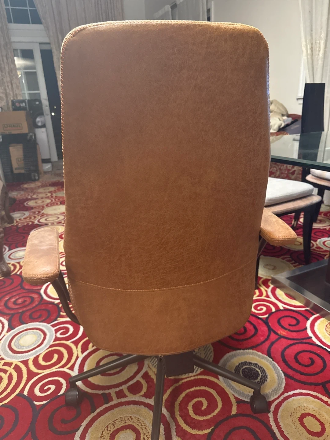 Comfortable office chair upholstered in brown faux leather. It features a cushioned seat and backrest with armrests for support. The base has wheels for easy mobility.