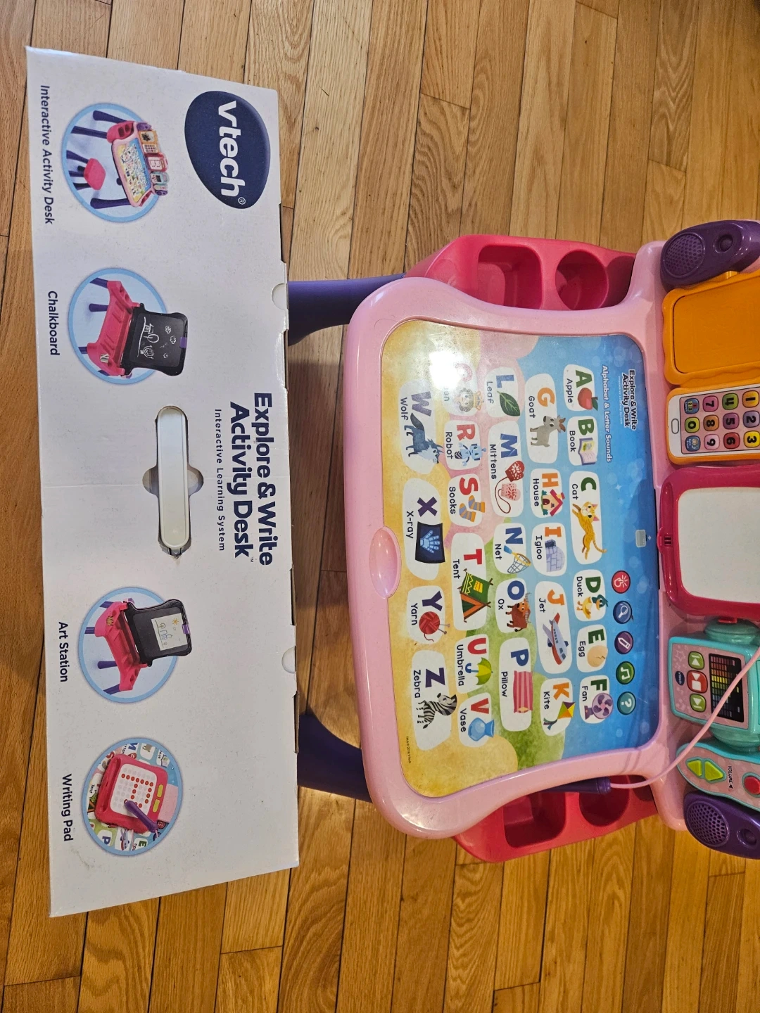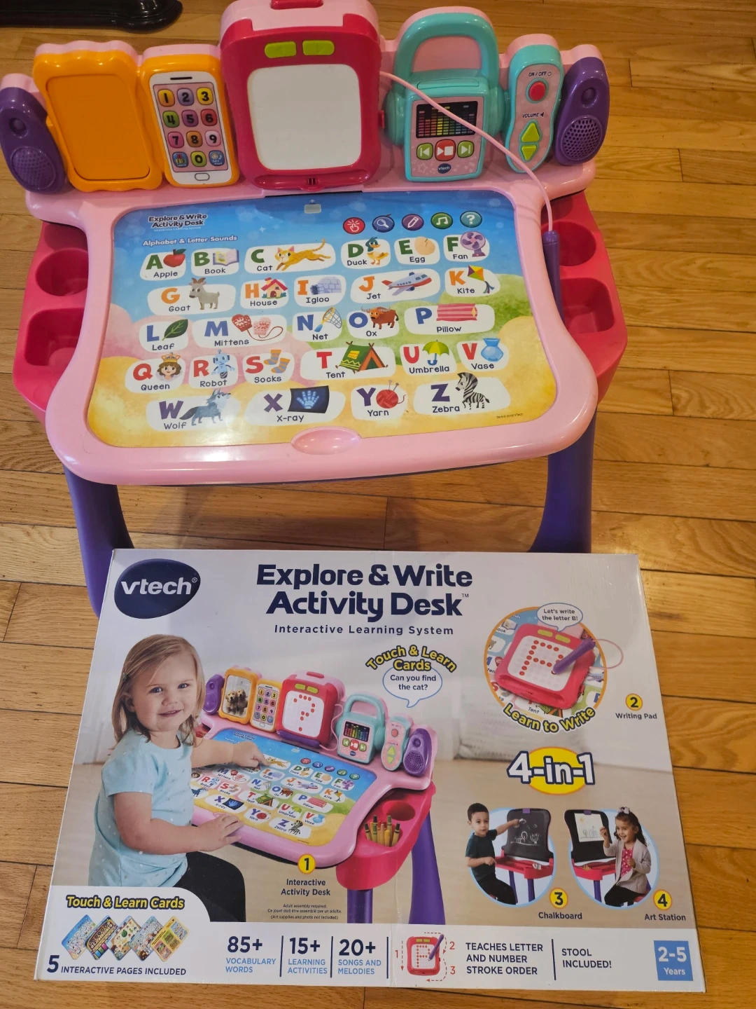 Selling a VTech Explore & Write Activity Desk! It's an interactive learning system for kids. Features: - Interactive Activity Desk - Writing Pad - Chalkboard - Art Station It includes touch & learn cards and teaches letter and number stroke order. Stool is also included! Recommended for ages 2-5 years