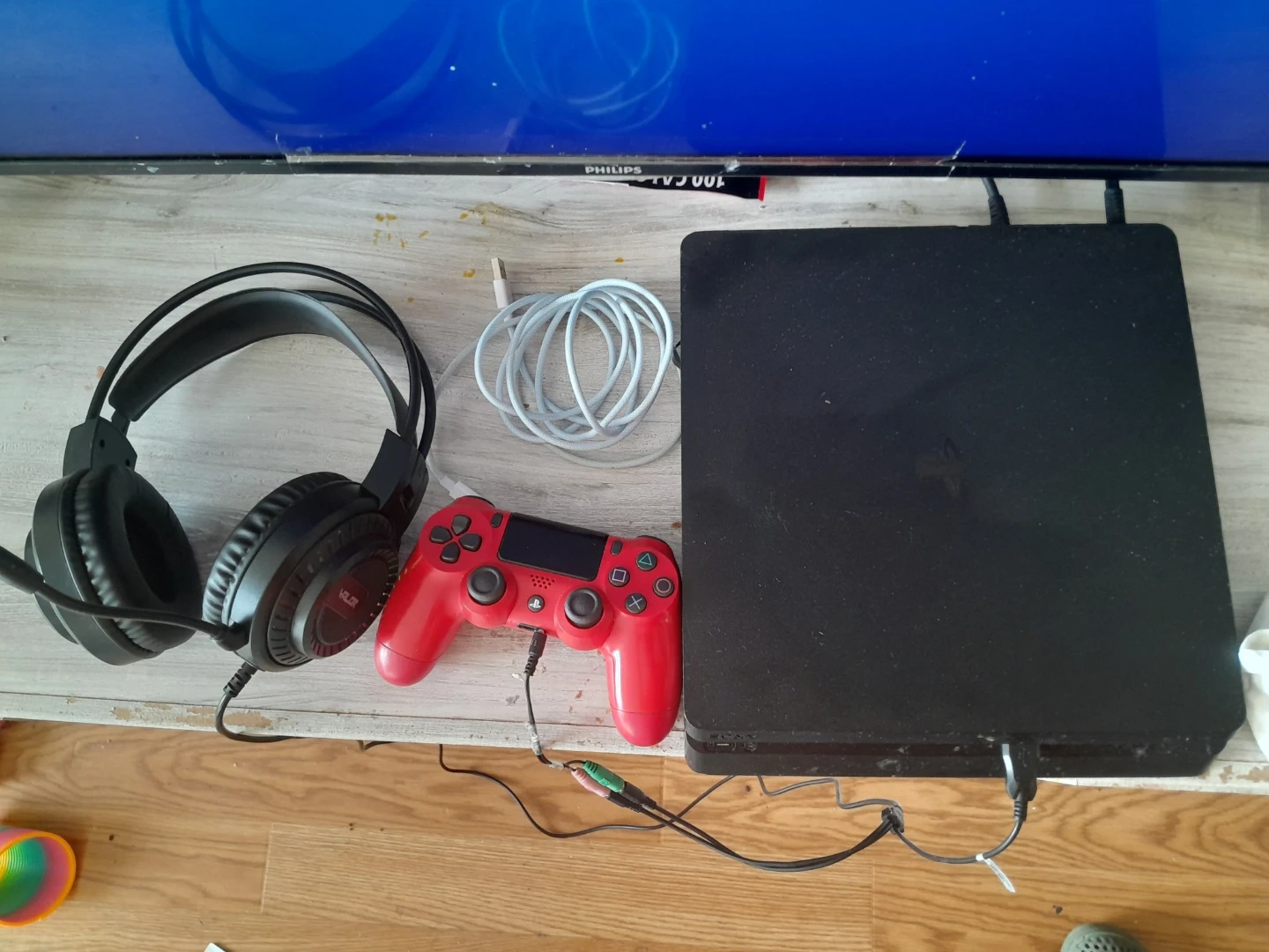 This bundle includes a black PlayStation 4 Slim console, a red DualShock 4 controller, and a pair of black gaming headphones. All necessary cables are included for setup. Perfect for diving into your favourite games!