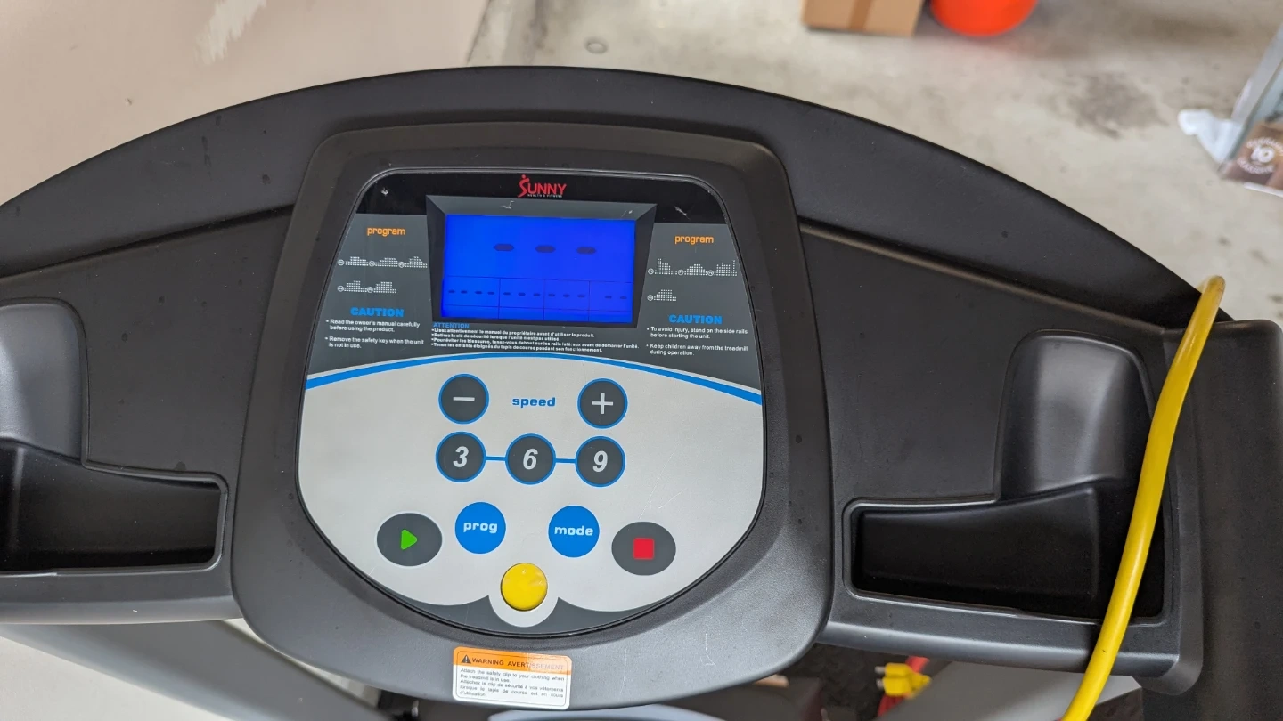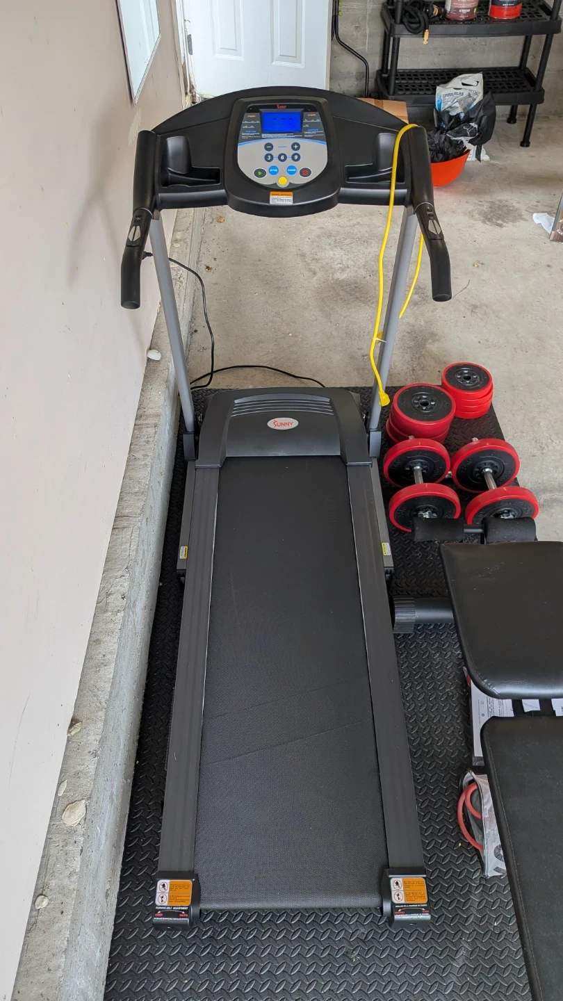 Folding Treadmill: Sunny Health & Fitness brand, model TM-1. Folding for easy storage. Includes manual and extension cable. More technical information at the link below.