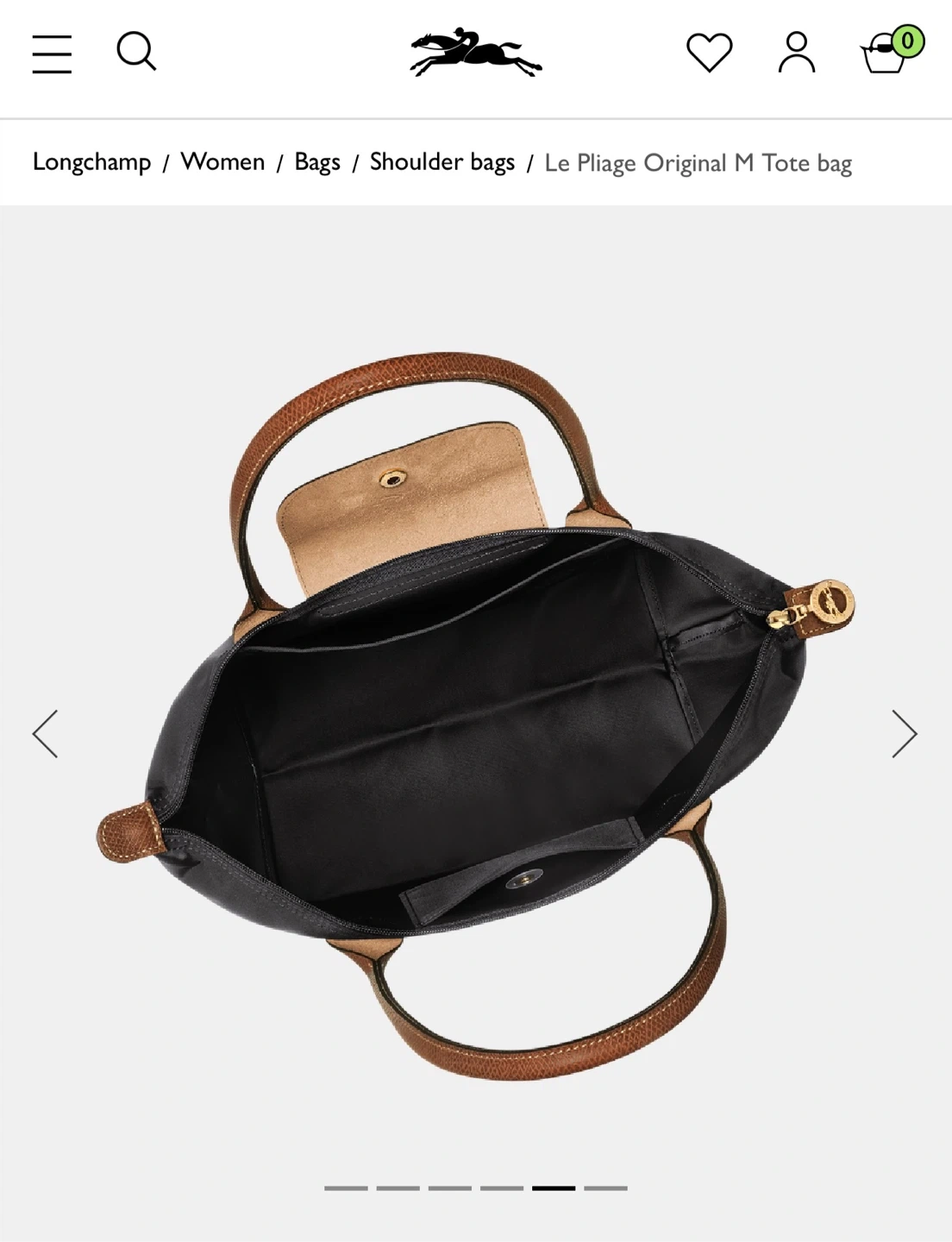 This is a Longchamp Le Pliage Original M tote bag. It's black with brown leather trim and handles. The interior is lined and includes a small pocket.