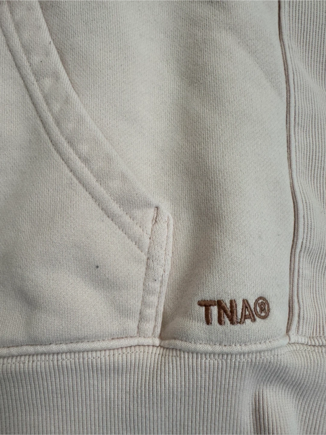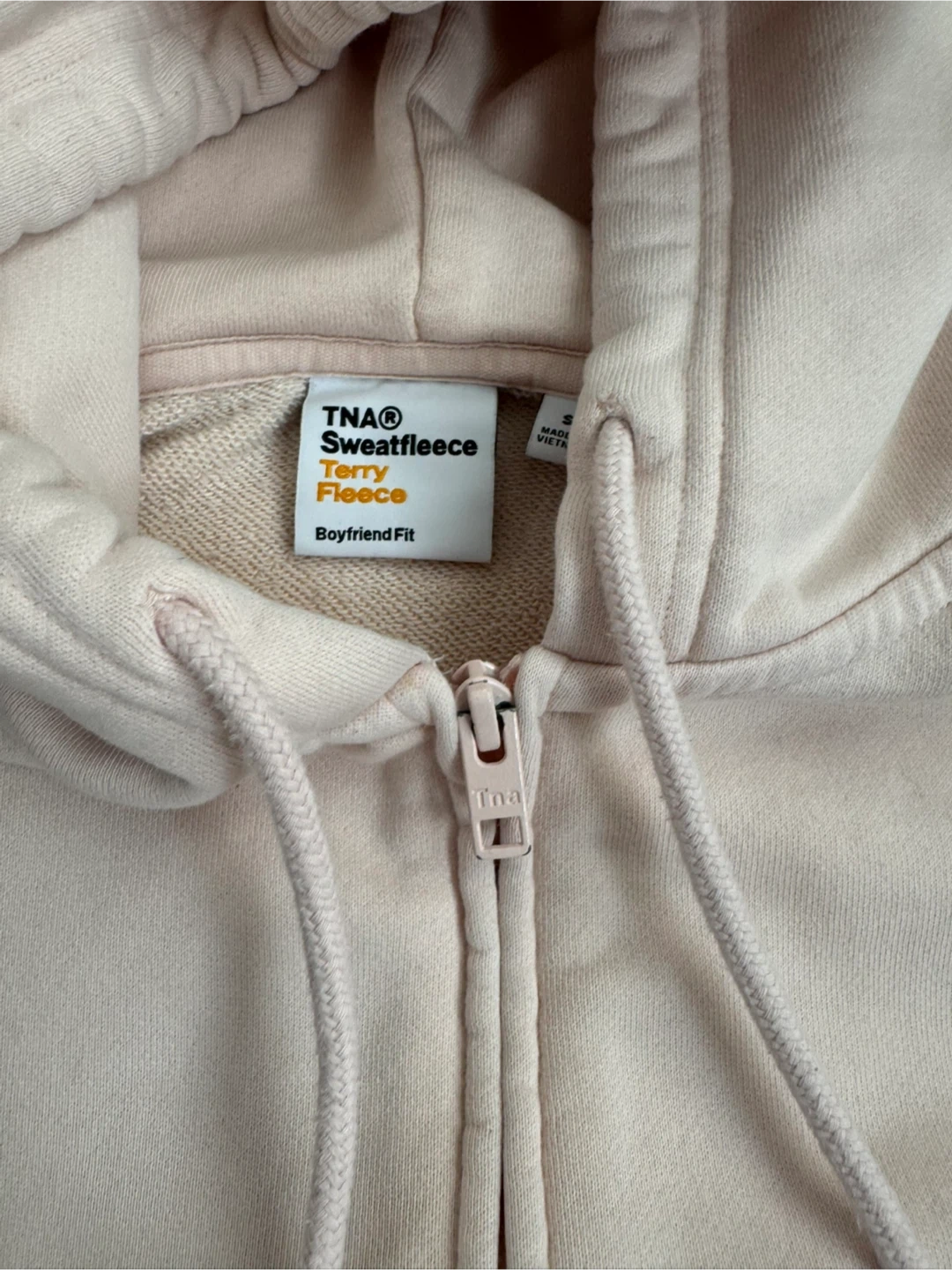 This is a TNA® zip-up hoodie made with Terry Fleece. It features a boyfriend fit. It's a comfortable and stylish piece for everyday wear.