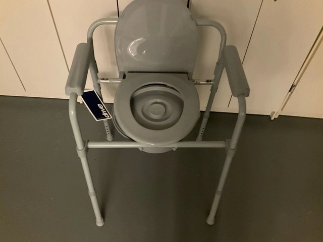 Raised toilet seat with sturdy support arms, ideal for seniors, post surgery recovery or anyone needing extra stability in the bathroom. The armrests provide added balance and make it easier to sit down and stand up safely. Features: -Durable metal frame with padded armrest -Elevates seat for easier use -Adjustable height legs -Non-slip rubber feet for stability -Lightweight and easy to move -Never used. Perfect for home use, recovery after surgery or assisting mobility.