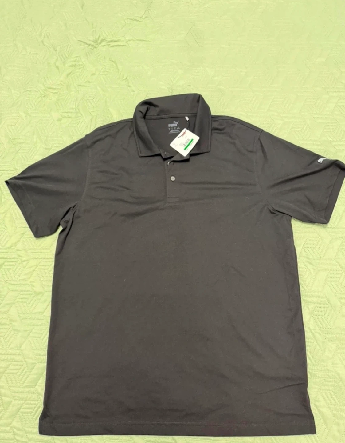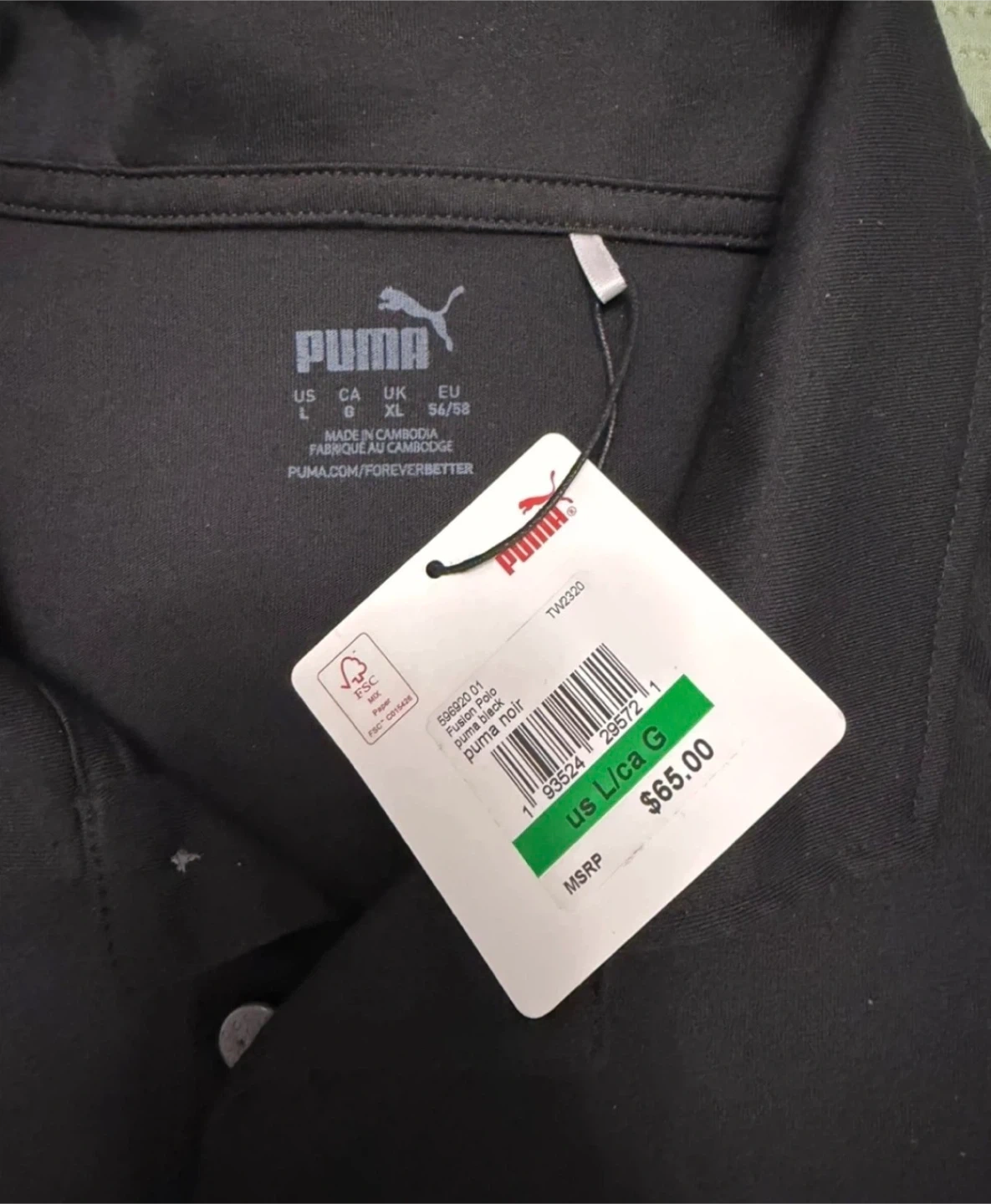 This is a Puma Fusion Polo shirt in black. It's a size large (US/CA L, UK XL, EU 56/58). It's made in Cambodia. This shirt is suitable for casual wear or golfing.