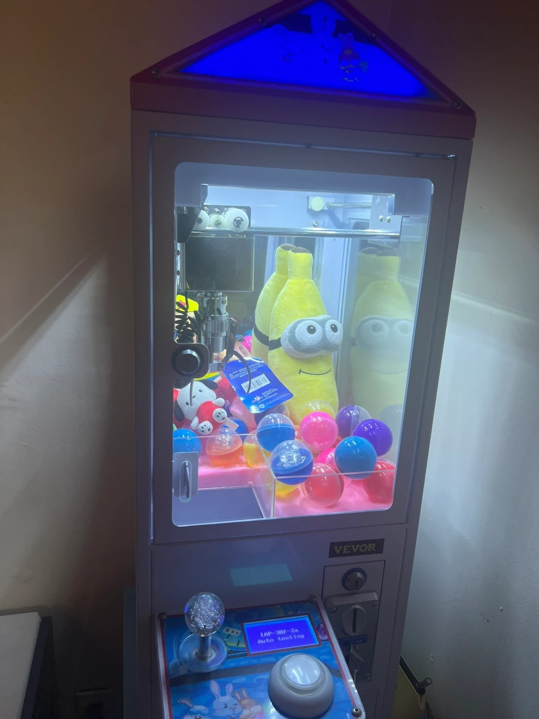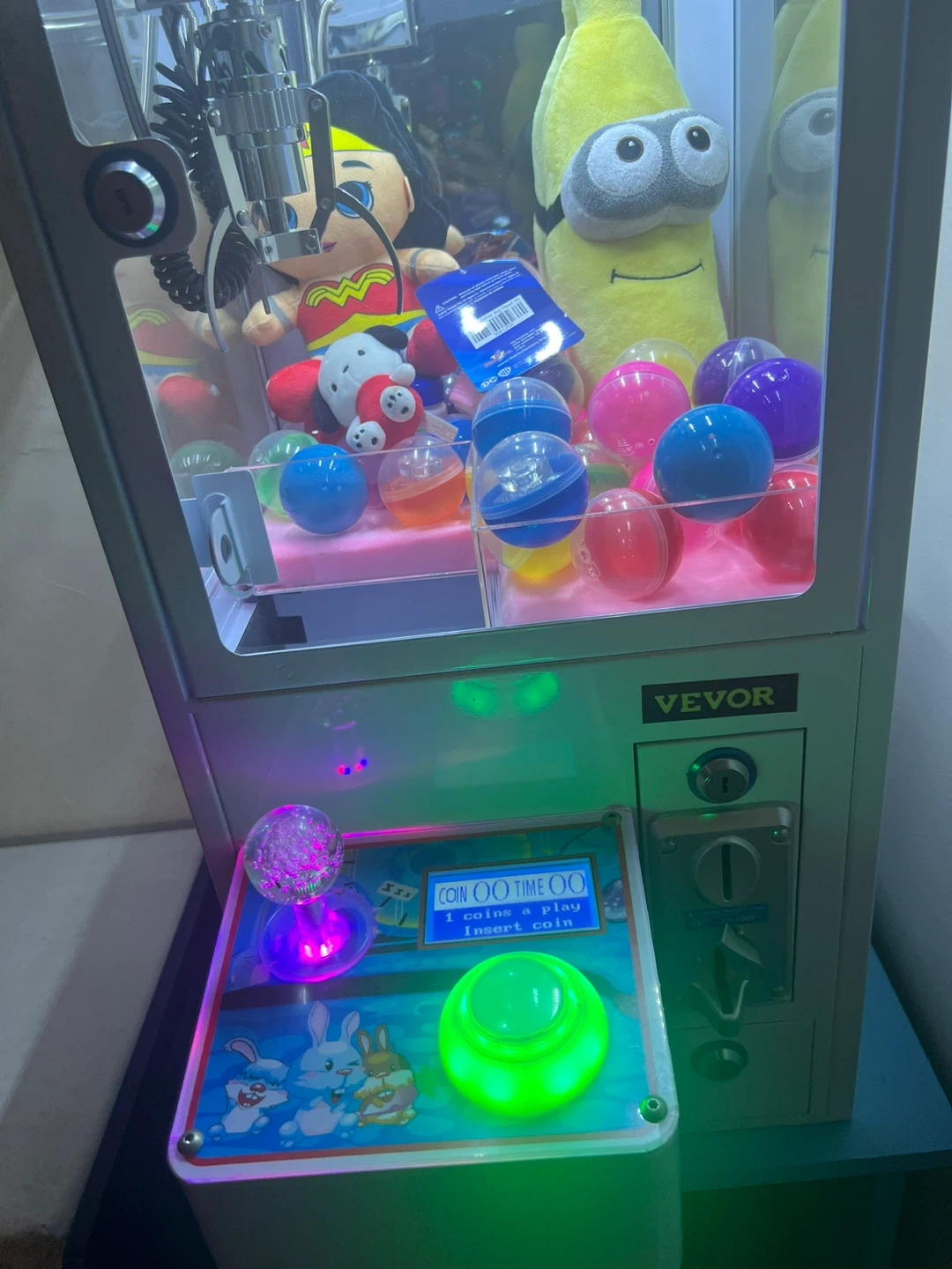This brand new mini claw machine is perfect for parties or home entertainment. It includes plush toys and colorful capsules, ready to be won! It's designed for coin operation, making it a fun addition to any game room.