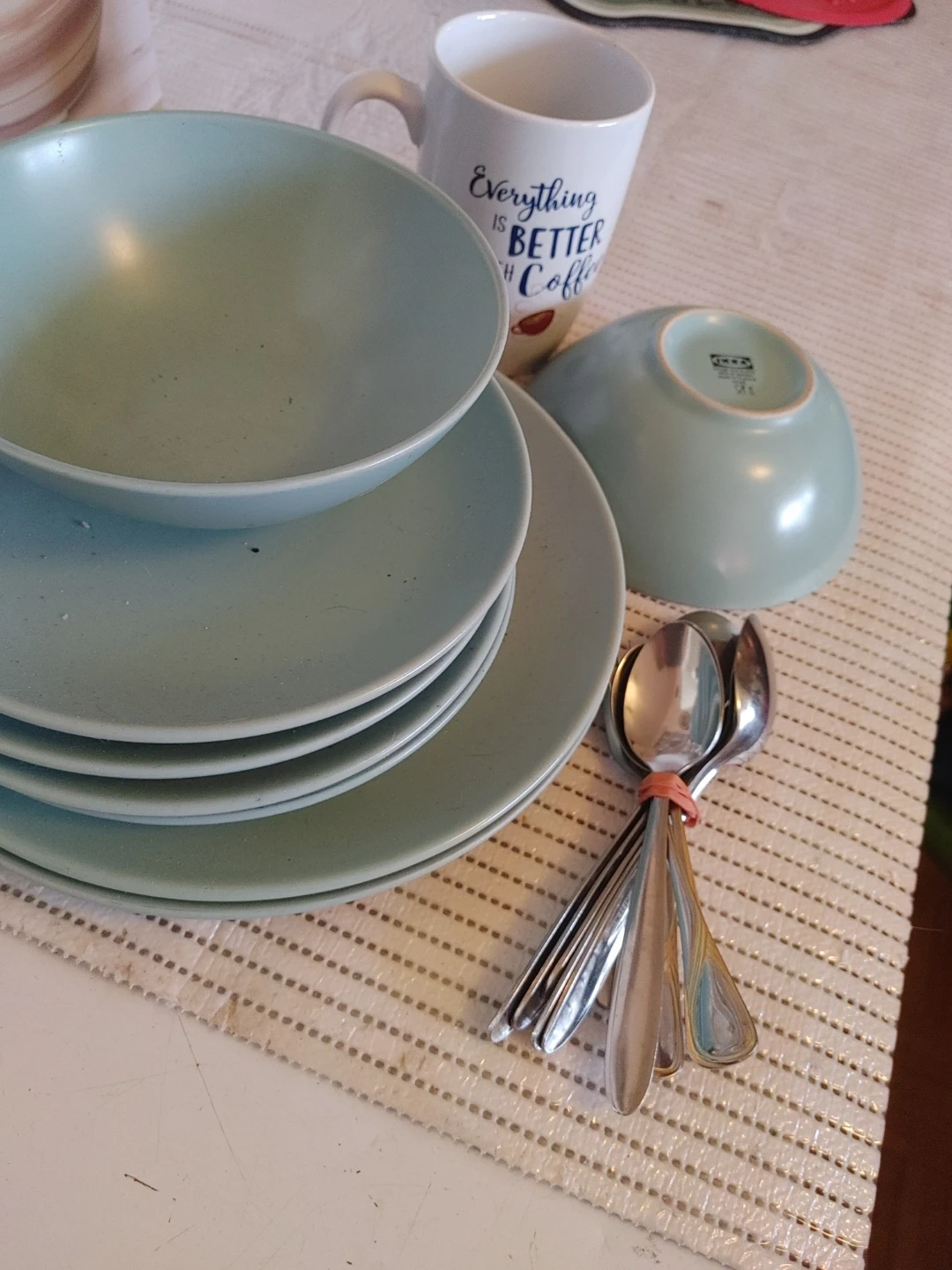 A set of four light blue IKEA plates and a matching bowl. It also includes a white mug with 'Everything is better with coffee' printed on it. & cutleryThis set is perfect for a small household or for adding to your existing collection.