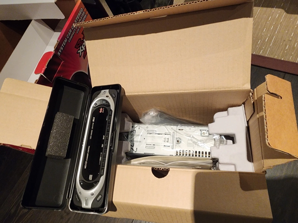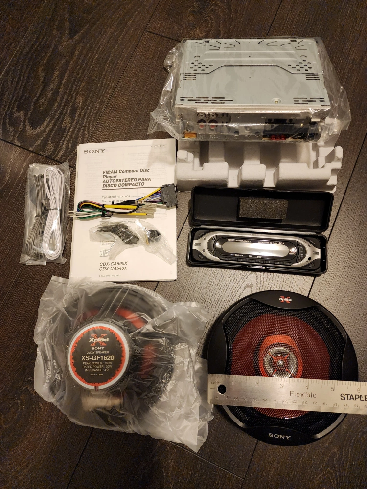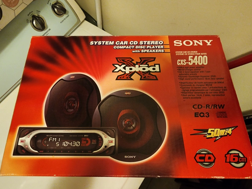 New Sony Xplod car stereo system. Includes CD player, two speakers, and wiring harness. Model number CDX-S5400. Never installed.