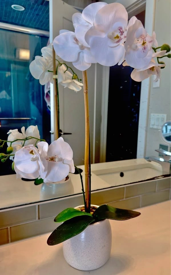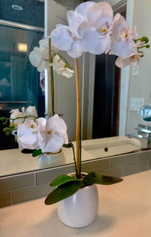 Beautiful artificial white orchid arrangement in a stylish ceramic pot. This piece adds a touch of elegance and calm to any space—perfect for bathrooms, living rooms, offices, or entryways. Realistic orchid blooms with detailed petals. Neutral white ceramic pot fits any décor style. No maintenance required (no watering, no mess!). Great for modern, minimalist, or spa-like interiors. Excellent condition, like new. Medium size, perfect for countertop or shelf display.