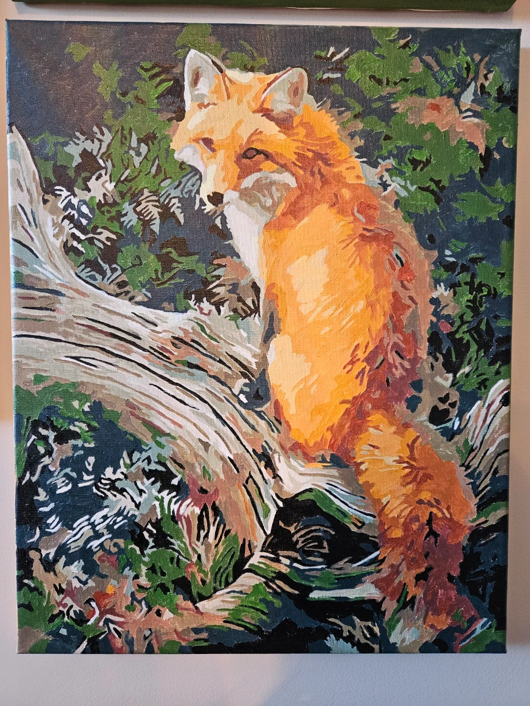 This is a finished canvas featuring a red fox on a log. The artwork is vibrant with greens and oranges. It's a nice addition to any nature lover's home!