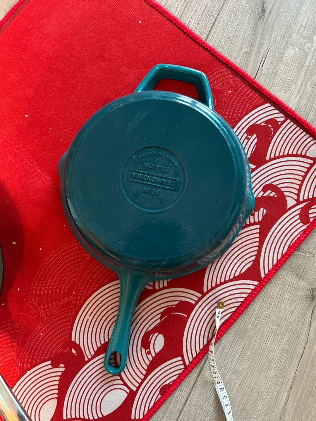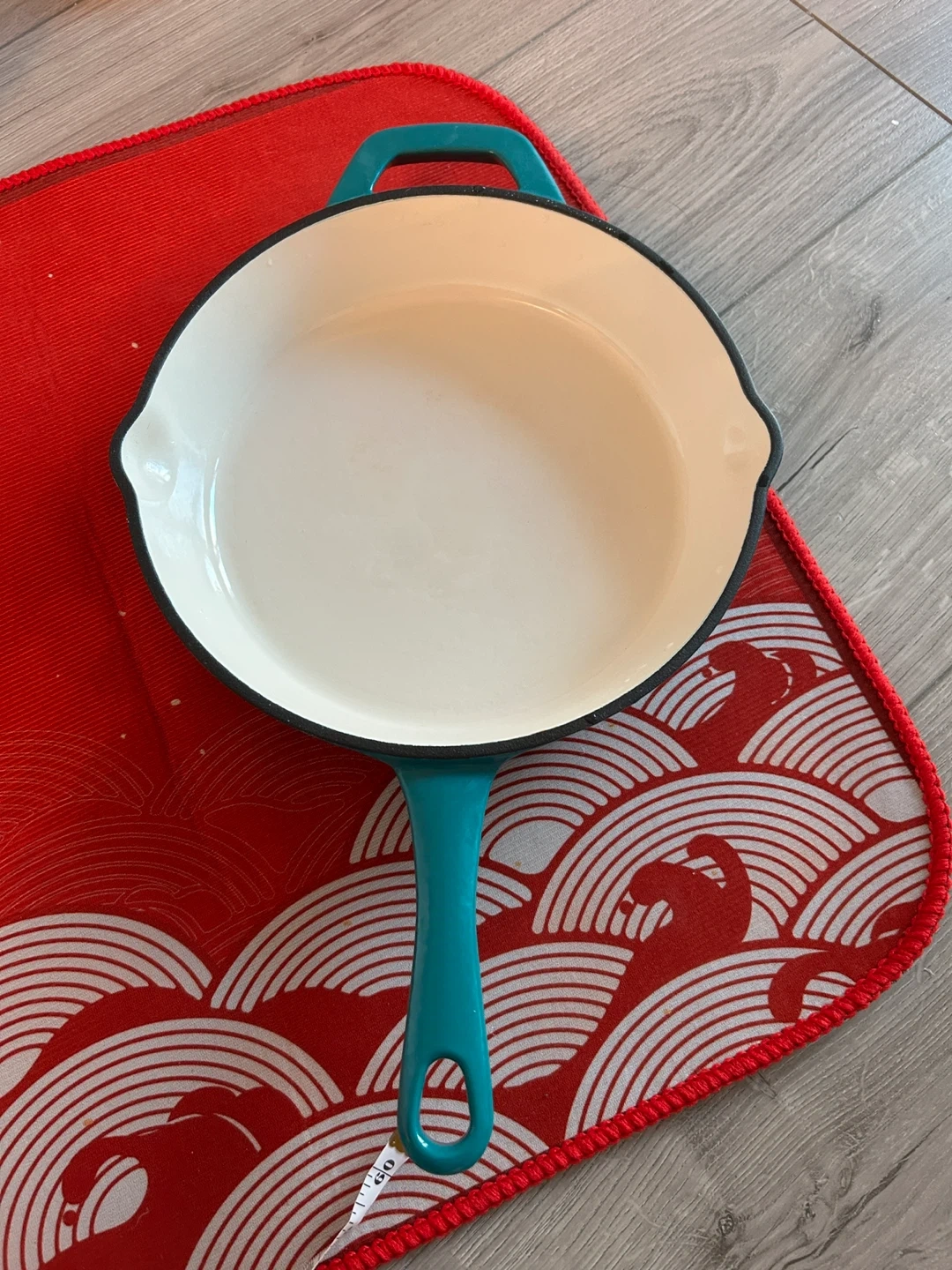 This is a Tramontina 10-inch enameled cast iron skillet. It's great for searing and slow cooking. It comes in a teal colour and is made of durable cast iron.