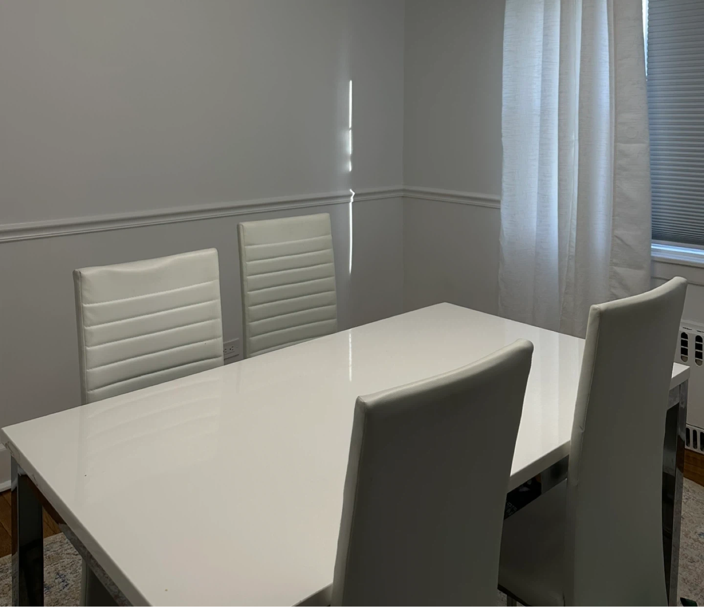 Modern white dining table with a glossy finish and chrome legs. Comes with four matching white faux leather chairs. Chairs have a sleek, modern design with horizontal stitching detail. Seats up to four people comfortably.