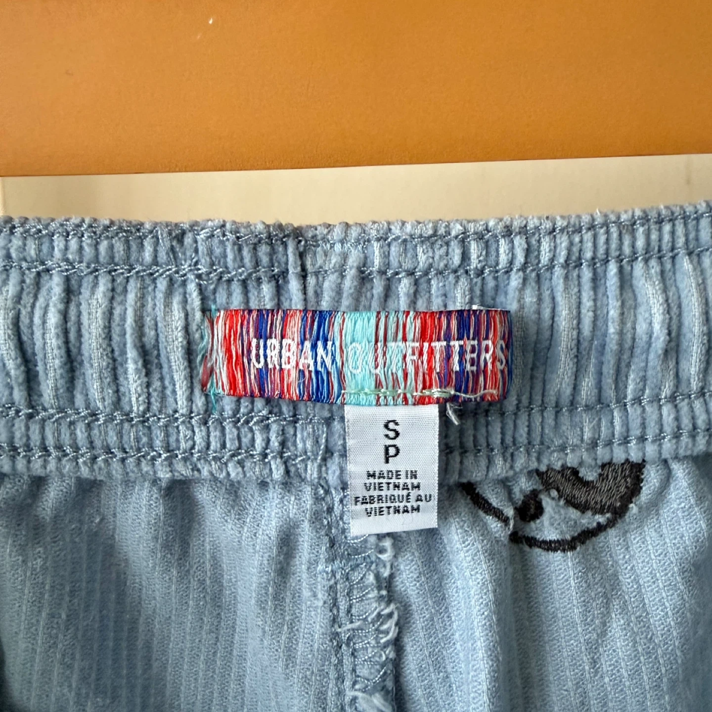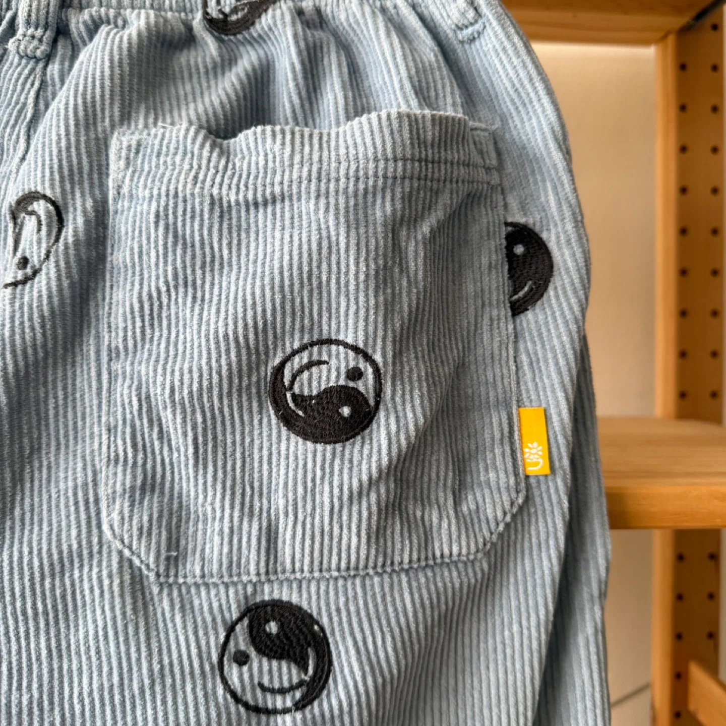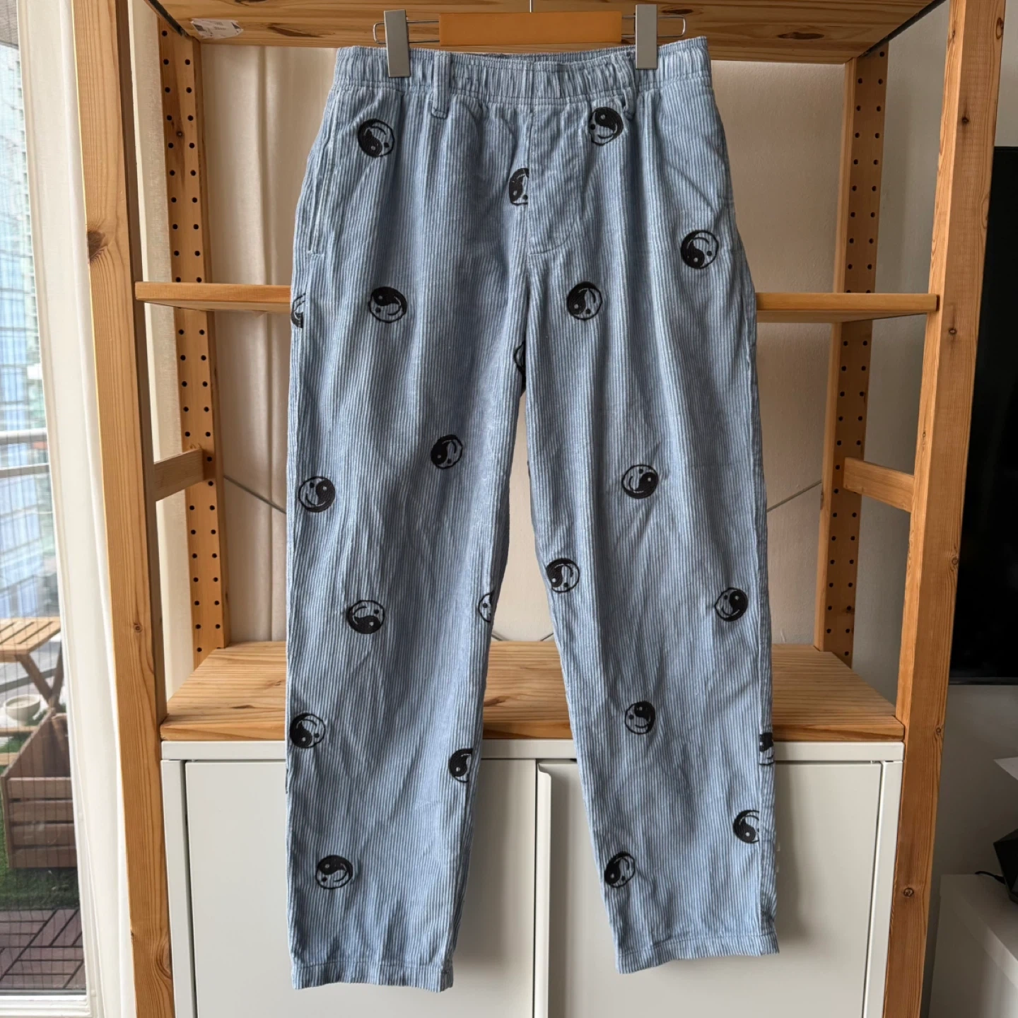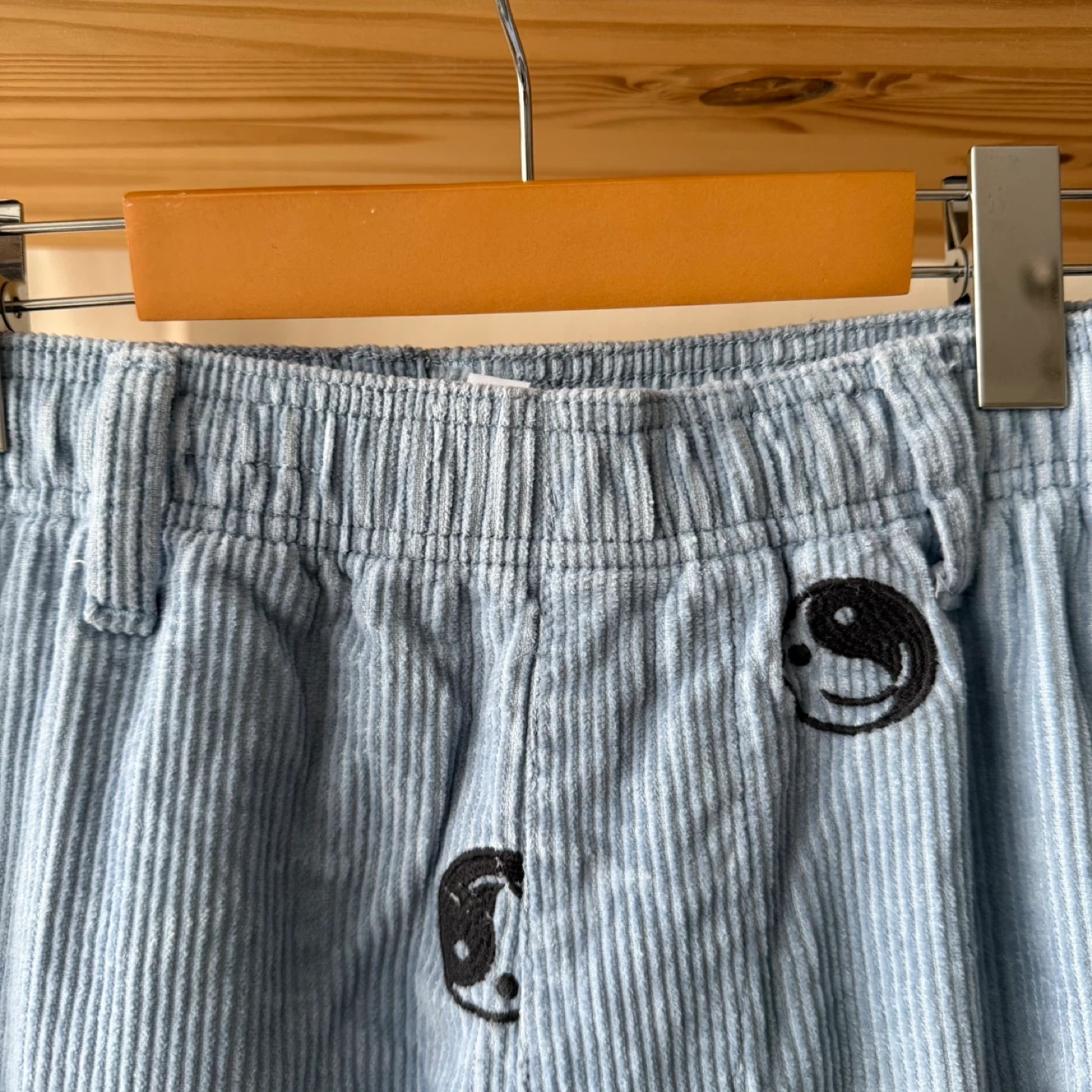 Light blue corduroy pants by Urban Outfitters. Features a pattern of yin and yang symbols. Made in Vietnam.