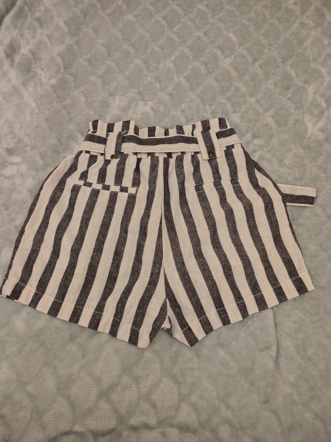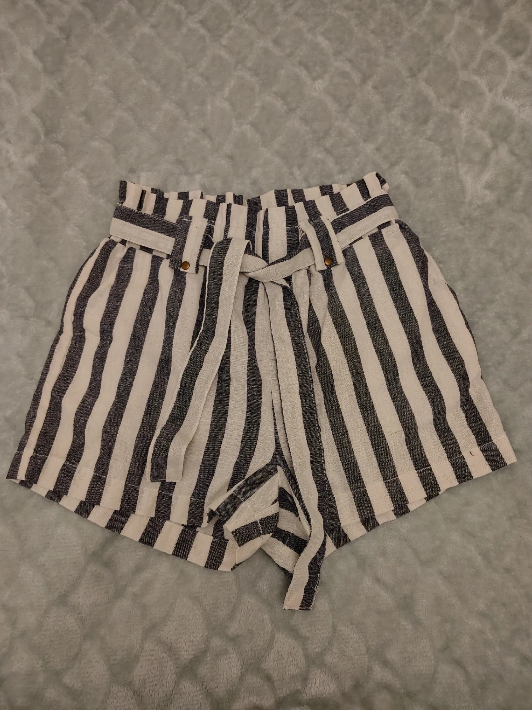 These paperbag waist shorts feature a classic black and white stripe pattern. They have a tie-waist closure and two back pockets. Made with a linen-blend fabric. Size small