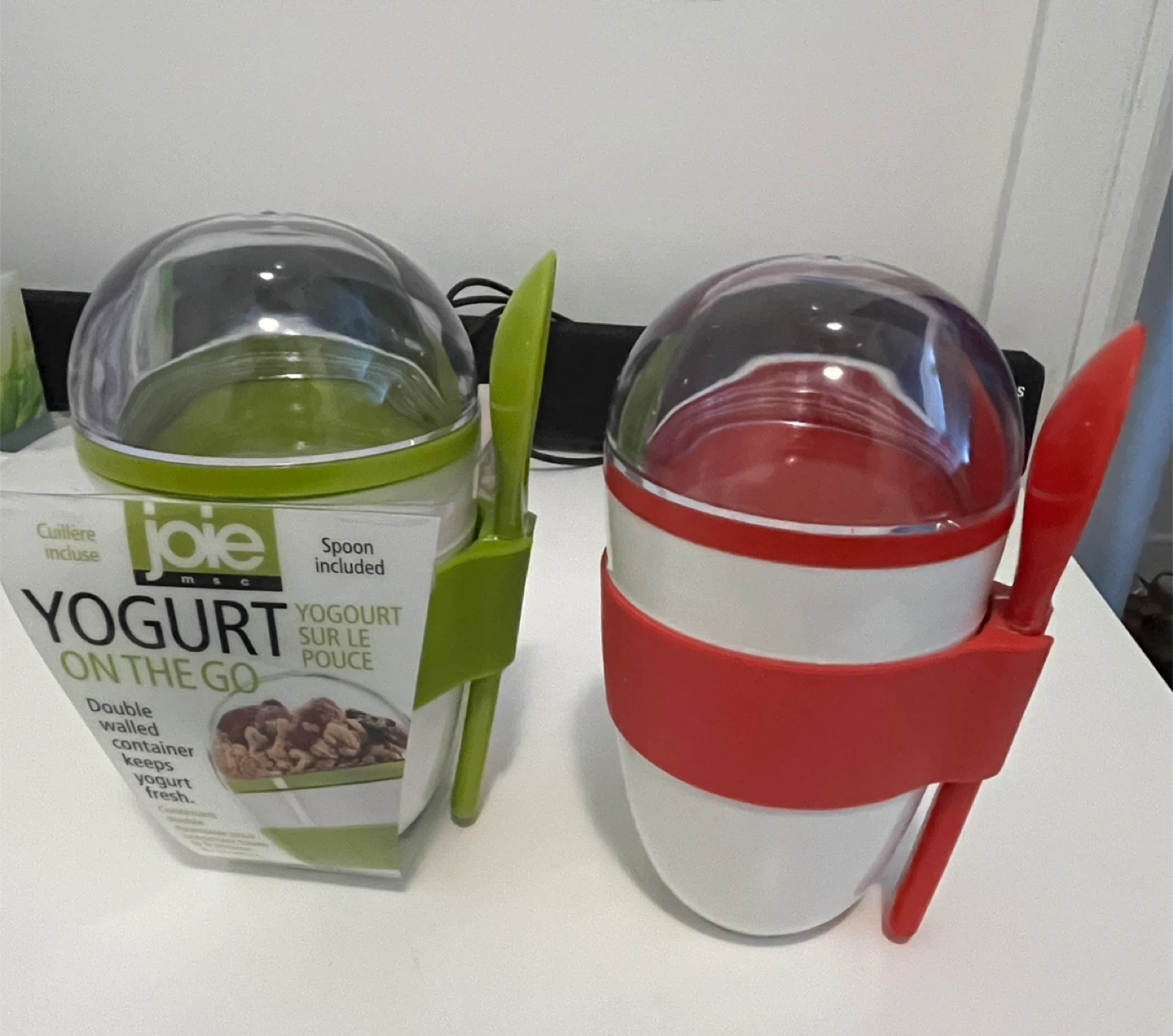 2 Joie Yogurt on the Go containers one in green and one in red. It's a double-walled container designed to keep yogurt fresh. A spoon is included with each container.