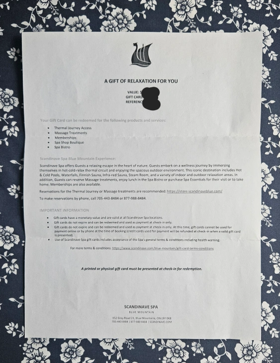 23$400 Scandinave Spa Blue Mountain gift card. Recieved it from my employer as a gift. Redeemable for various spa services including thermal journey access, massages, memberships, and more. Valid at all Scandinave Spa locations.