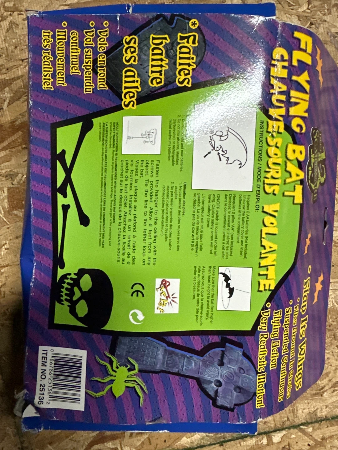 70Get ready for Halloween with this Scarywane Flying Bat! It flaps its wings for a spooky, realistic motion. Perfect for adding a touch of fright to your decorations