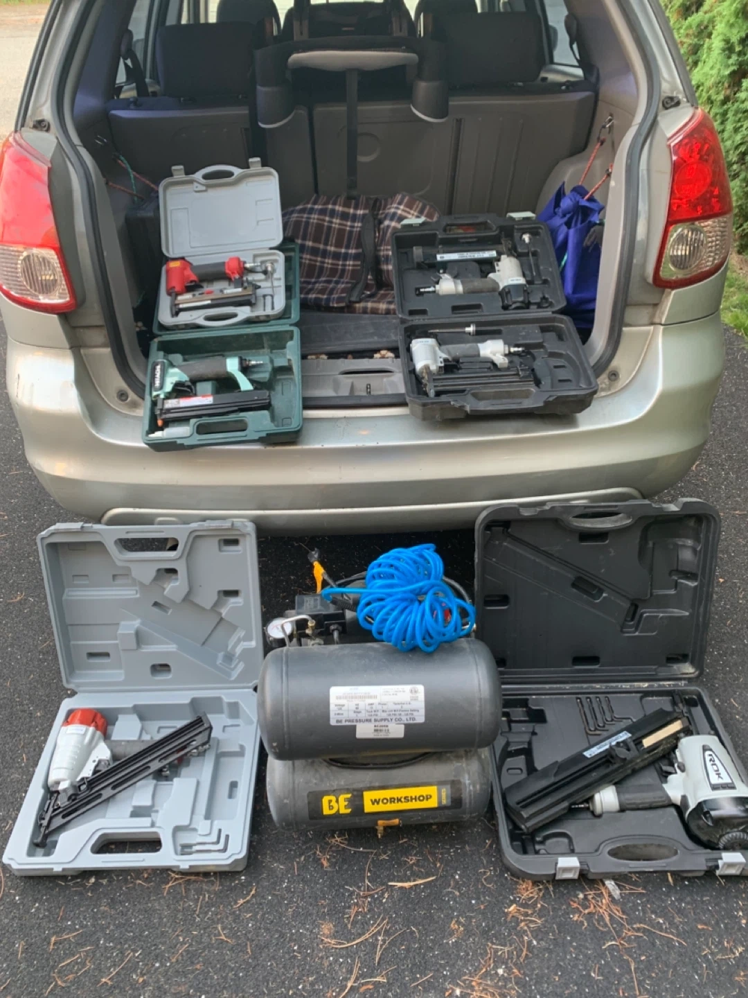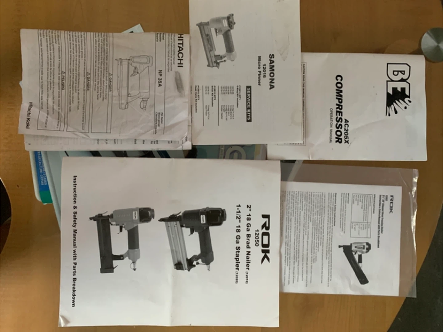 Includes a BE Compressor and various air nailers and staplers from brands like ROK and Hitachi. These tools are great for woodworking and upholstery projects. This set comes with everything you need to get started on your next DIY! It's a handy collection for any workshop.
