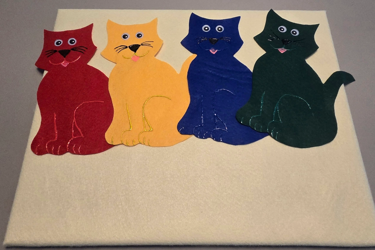 10Cute cat felt board with red, yellow, blue, and green cats. Crafted by me with new felt materials. never been used. Comes with the cats and the laminated story.